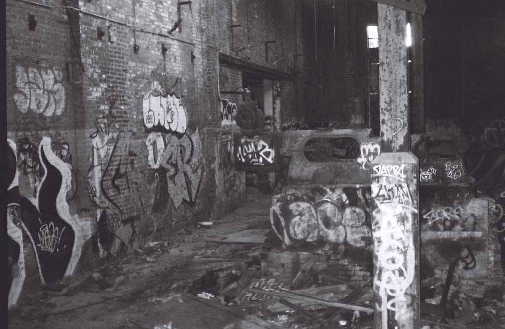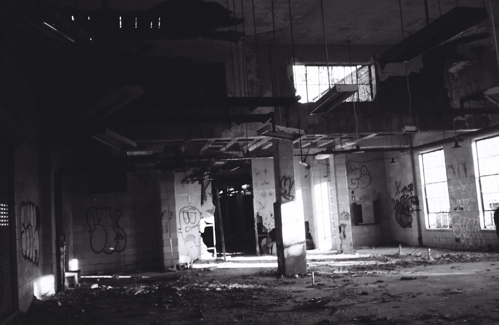 The Gingerbread house was the 2nd time me and my boyfriend went urban exploring and his brother + brother’s girlfriend came with us this time. We parked down the road at a public park and walked over, entering through the Wheatsworth Mill. It wasn’t difficult finding an entry into the factory since it was pretty much left wide open. While some areas were bright from the window light, other parts were pitch black and required flashlights. We made our way through the building, avoiding rooms with caved-in floors, and climbed up to the rooftop where we could see the entire property.