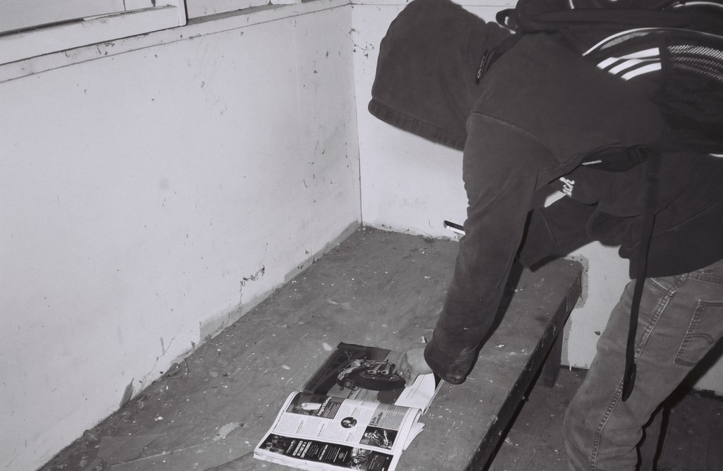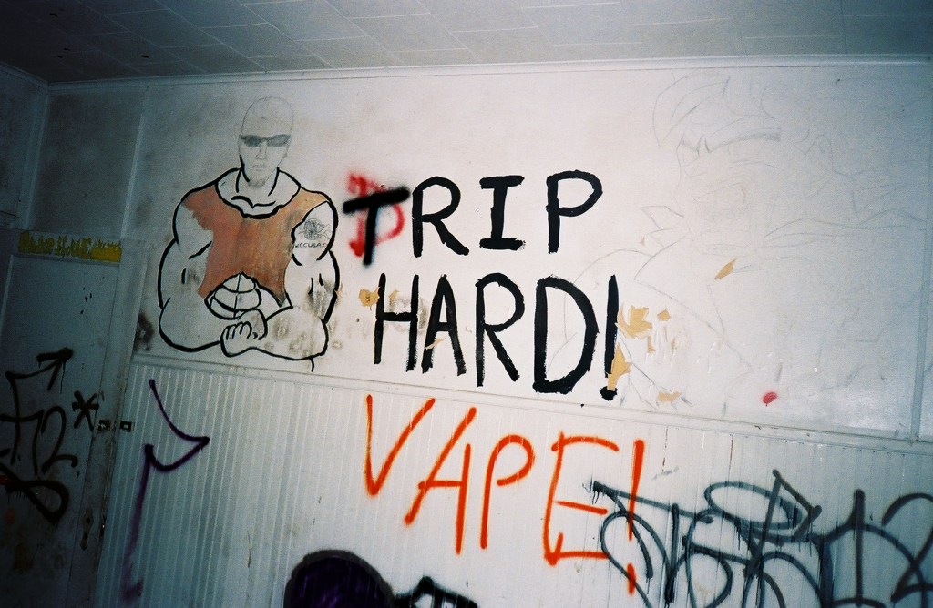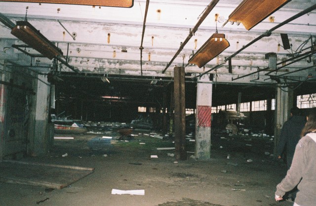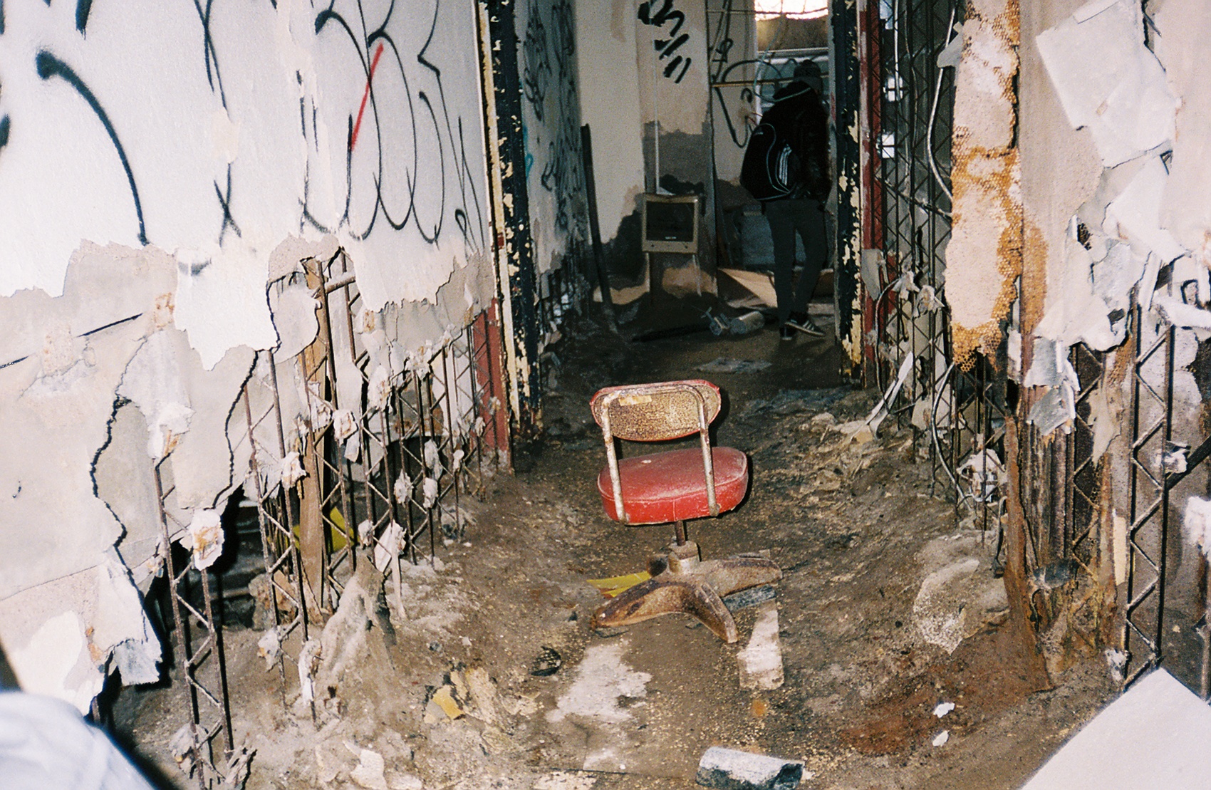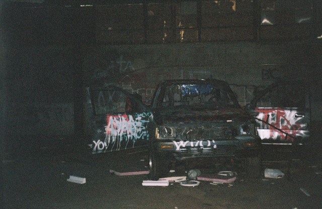 All of a sudden we hear loud music coming from nearby. We look out from the front of the building and see two modified race cars with amplifiers coming out of the trunk. People were gathered around the cars just hanging out. We walk over to the other buildings nearby the party of people, we casually say hello and go exploring inside.