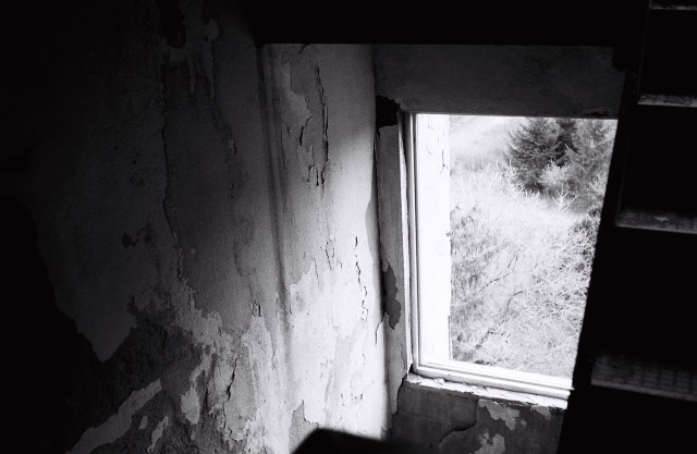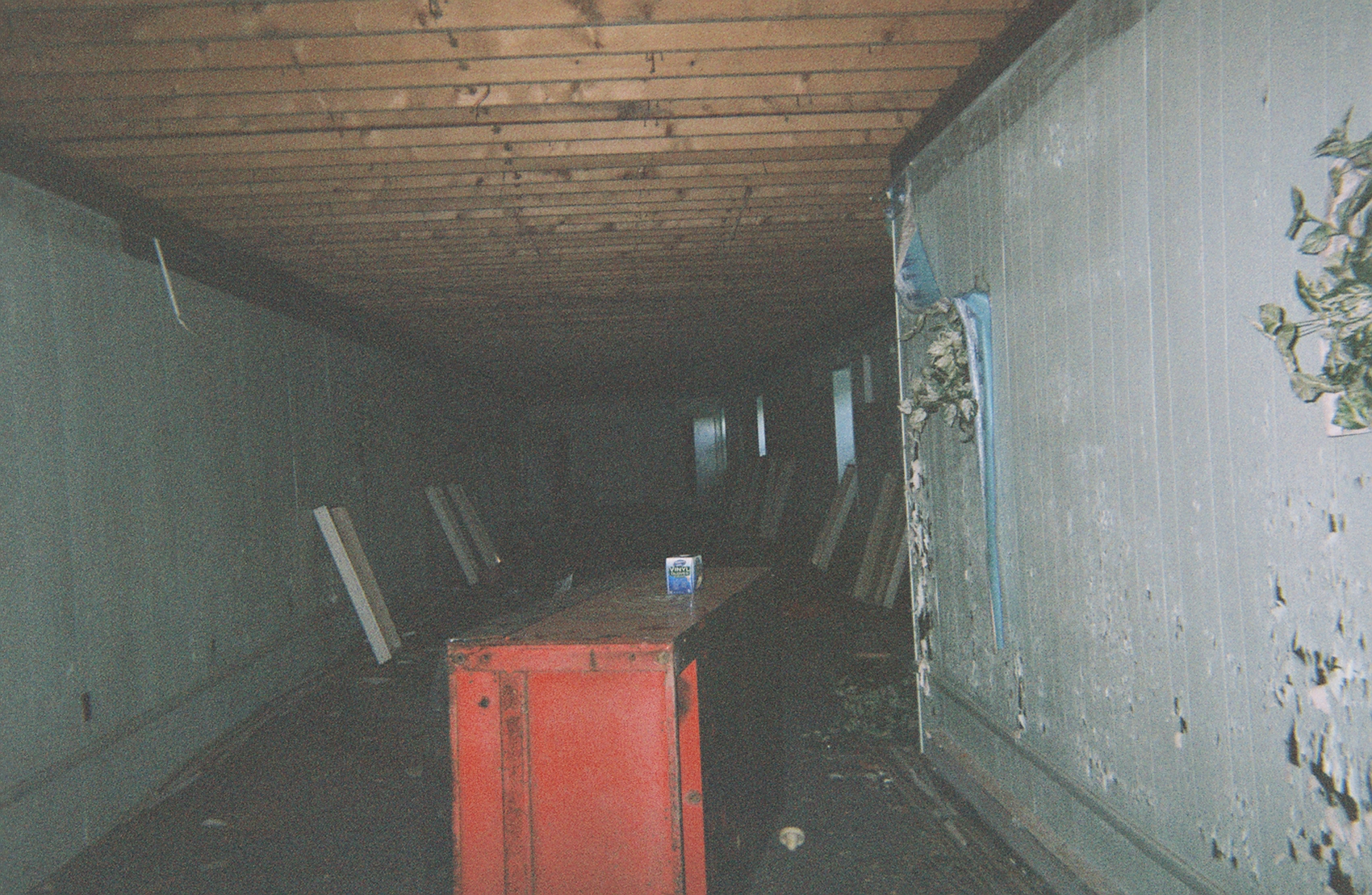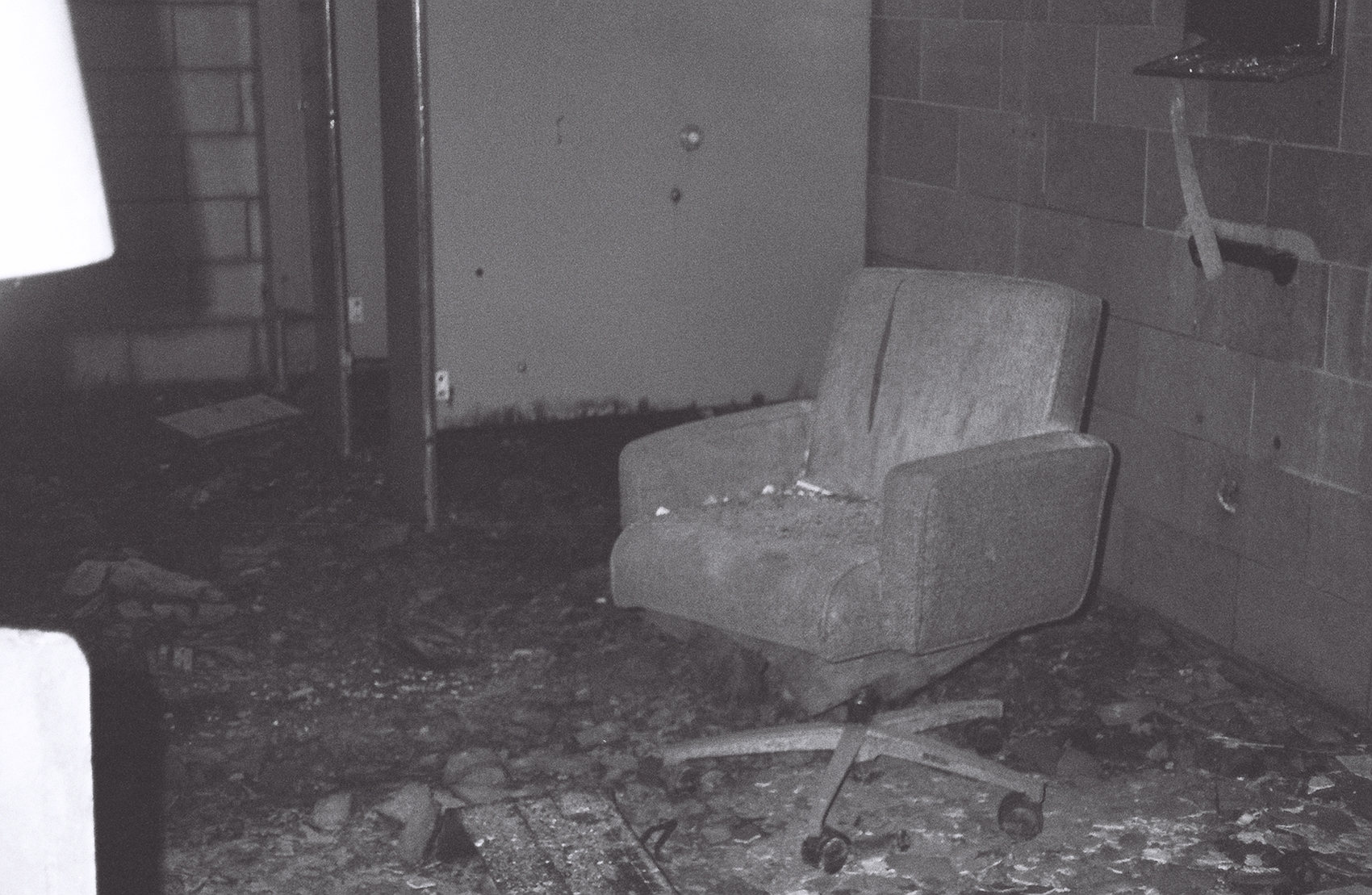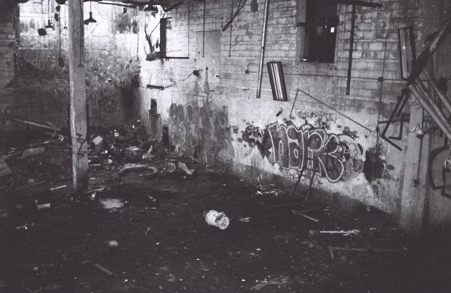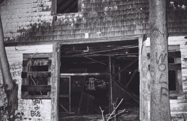 We enter the building through an open door that leads to a big empty room with no windows. At the end of the room is another open door that leads to another empty room with no windows. The deeper we go the darker it becomes. We come to a third room that is pitch black. We stand by the door way and hear a strange rustling sound coming from inside, like a creature of some sort. Creeped out by the spooky noises coming from the darkness, we retreat back the way we came.