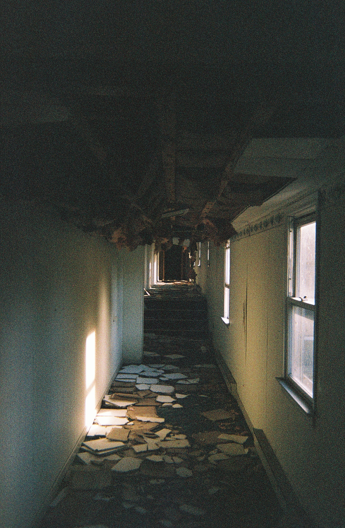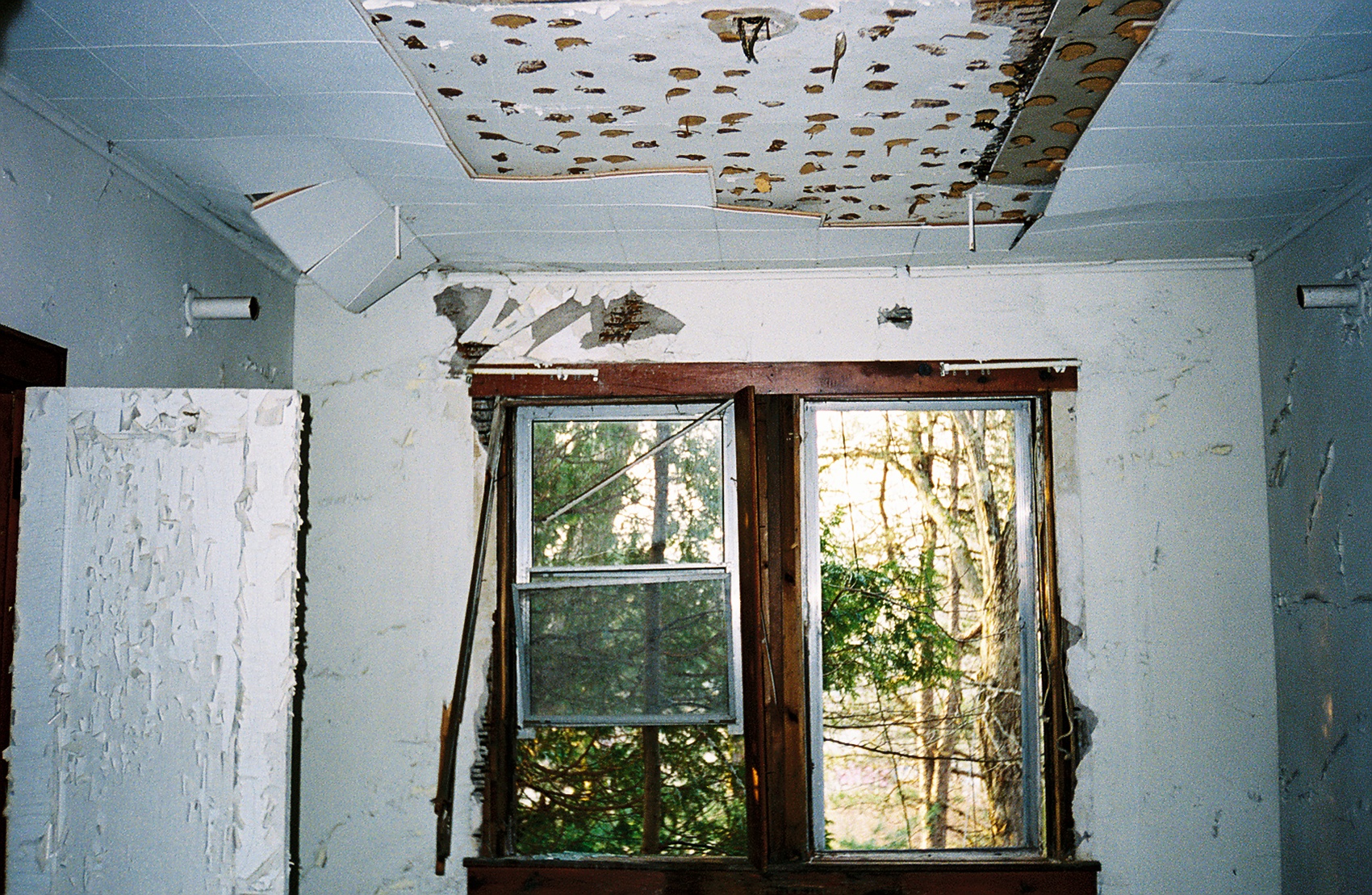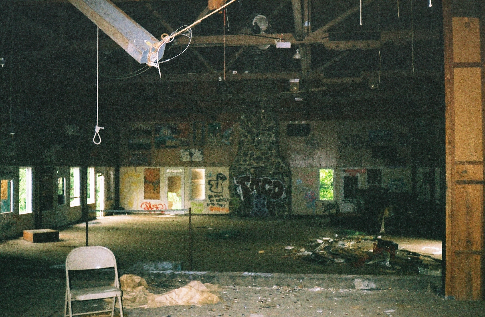 Grossinger is an erie place with sounds of slamming doors and the howling of the wind. It is dark and wet inside the buildings, lit only where there are windows, and in some areas the ceilings or floors are completely or partially caved-in. After seeing the white cabin we explored the rest of the grounds, we went to the kitchen/big dining area, and from there entered one of the buildings with atleast 6 floors of hotel rooms, we went up to the rooftop of that building and walked to the indoor pool before heading home. This being our initial visit, we were able to map out in our heads the layout of the space so we have a better idea of where to go the next time we went to Grossinger. Ariel views from googlemaps also came in handy with navigating our way around.