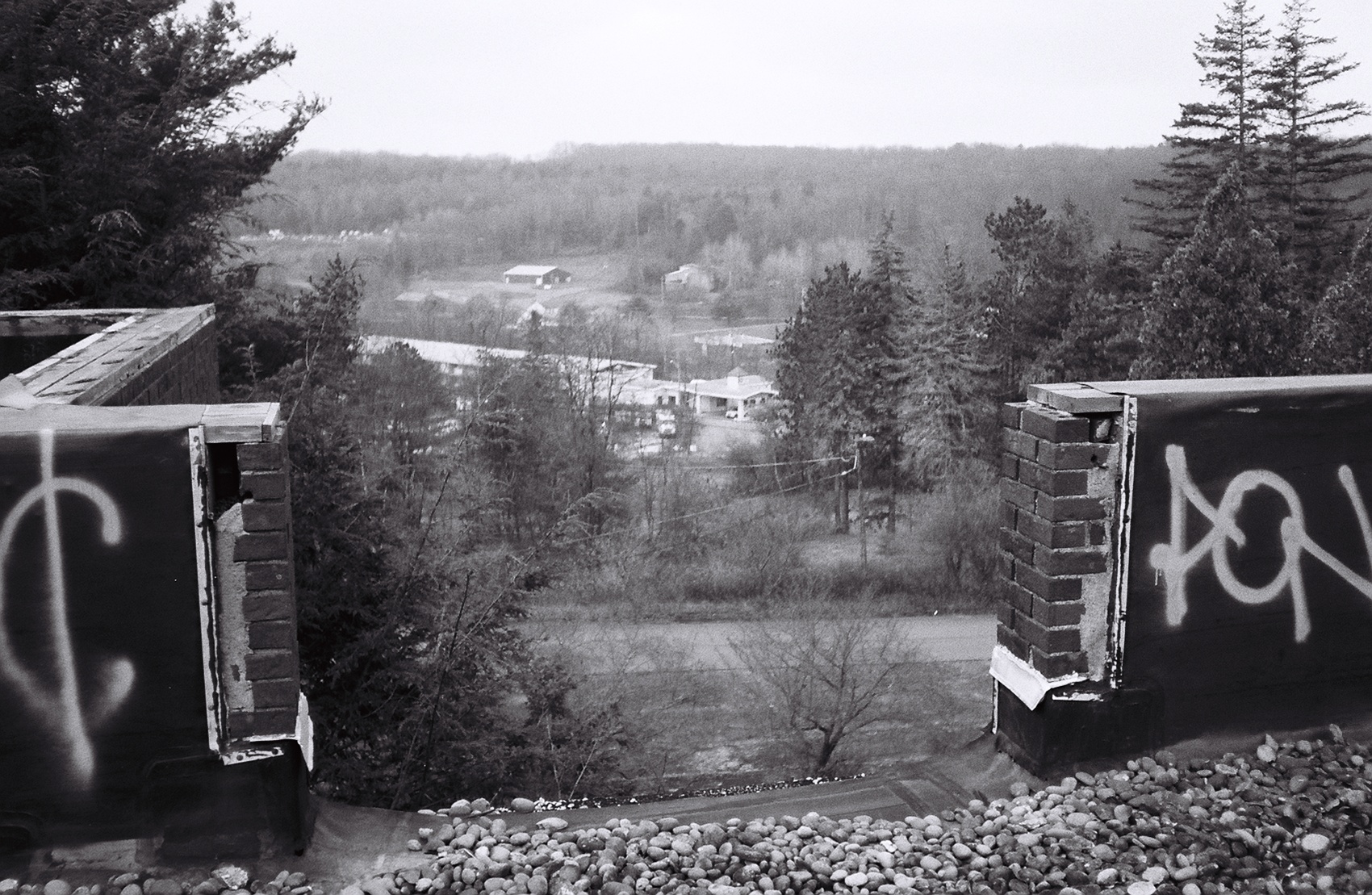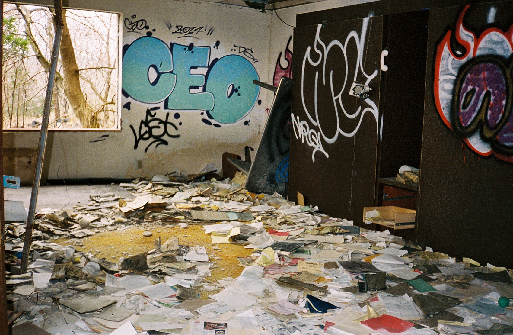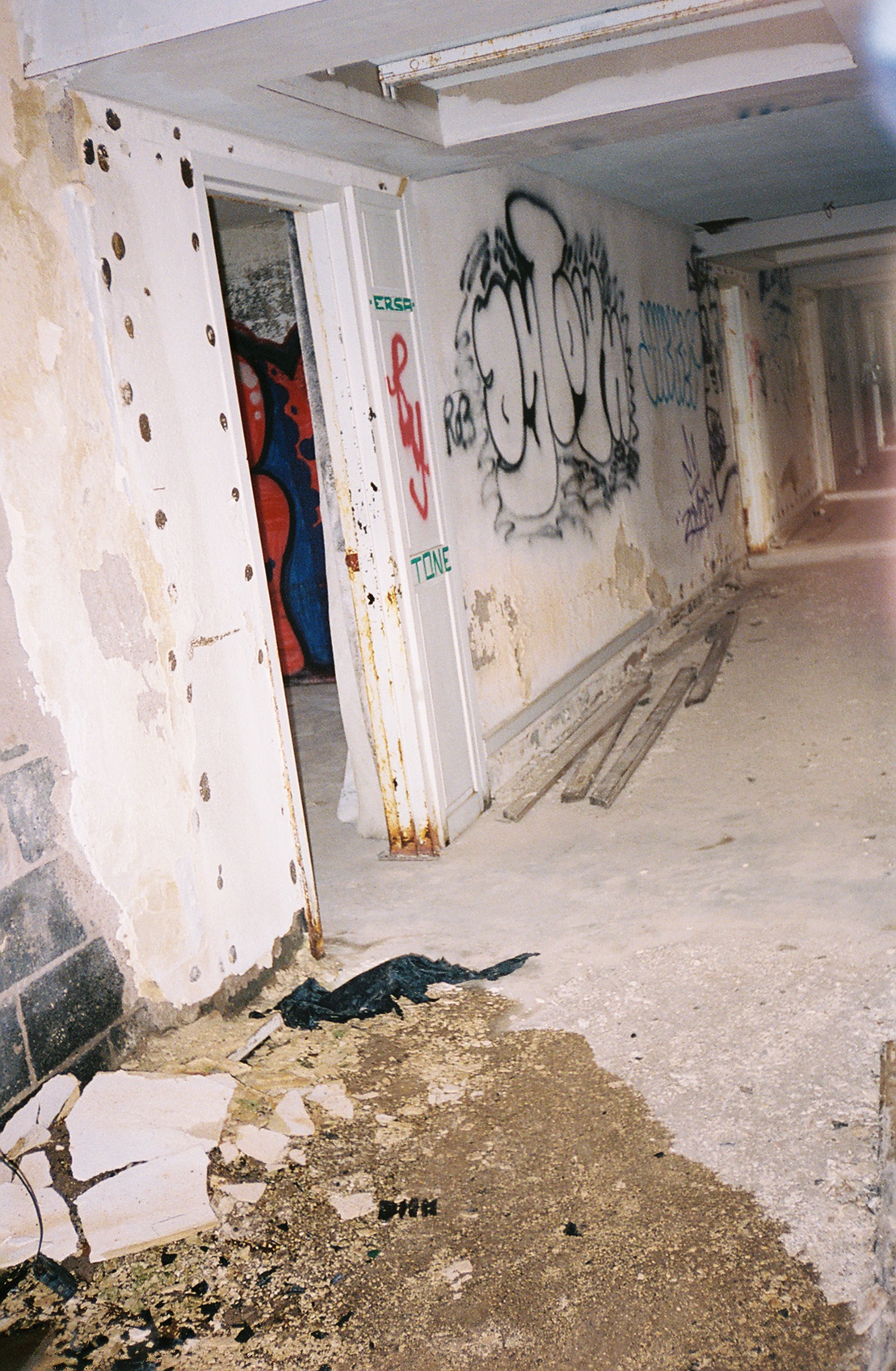 We got in through an opening in the fence and walked through the woods to a bridge. The bridge looked like it had seen better days but we decide to trust it anyways since it was the only way to cross the river. Once over the bridge, we were no longer in the woods. Next to us was a pond and on the other side of pond is the property. We walked around the pond until we got to a ditch with an industrial halfpipe sticking out. We climb over the ditch and find remnants of a road that used to exist and leads to the property. Down the road on the left was a small outdoor swimming pool and tennis courts and on the right was a children’s day care. This is the first building we entered. The daycare was pretty bad shape – colorful paint was pealing off the walls, the ground was wet and in some areas the floor was completely caved in. We continued down the road to the main area where the tower was. The next building we visited was where the old reception hall used to be. We entered through what looked to be the old lobby. The glass door had been shattered and only the door frame remained. We walked from the lobby into the grand reception hall, lined with ceiling to floor glass windows, half of which were shattered, the carpet was wet and degraded but sturdy enough for us to make our way through, The room was practically empty other than a couple of tables left over and tattered curtains. Then we went upstairs to a hallway lined with hotel rooms. Something that really freaked me out was the posters on the walls. The posters were of different men pointing guns and we found 3 or 4 of them in all. The gaze and directness of the photographs seemed so real and felt like a warning sign. We explored one more building before leaving. This we like to refer to as the porn house, since it is full of old porn magazines and heroin needles. It had high ceilings, a big fire place in the center of the room and spiral staircases on either side of the fire place that led to the 2nd floor. There was a painting left behind of a sun and a tree, but it was too big to take it with us so we left it in the fireplace to pick it up next time. Unfortunately it was gone by then.