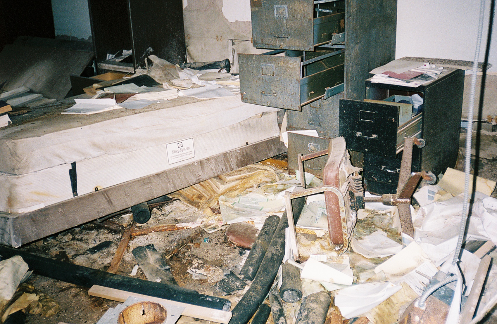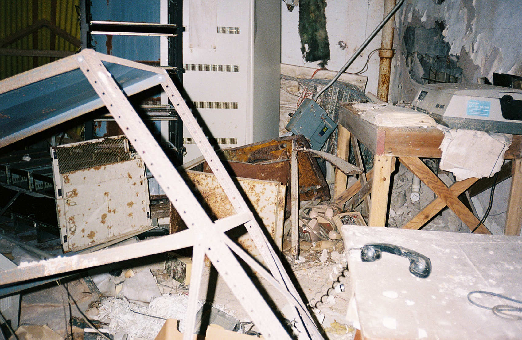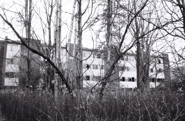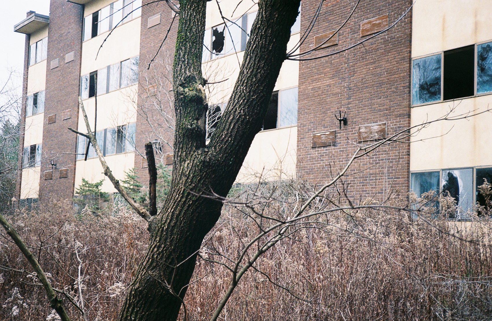 We got in through an opening in the fence and walked through the woods to a bridge. The bridge looked like it had seen better days but we decide to trust it anyways since it was the only way to cross the river. Once over the bridge, we were no longer in the woods. Next to us was a pond and on the other side of pond is the property. We walked around the pond until we got to a ditch with an industrial halfpipe sticking out. We climb over the ditch and find remnants of a road that used to exist and leads to the property. Down the road on the left was a small outdoor swimming pool and tennis courts and on the right was a children’s day care. This is the first building we entered. The daycare was pretty bad shape – colorful paint was pealing off the walls, the ground was wet and in some areas the floor was completely caved in. We continued down the road to the main area where the tower was. The next building we visited was where the old reception hall used to be. We entered through what looked to be the old lobby. The glass door had been shattered and only the door frame remained. We walked from the lobby into the grand reception hall, lined with ceiling to floor glass windows, half of which were shattered, the carpet was wet and degraded but sturdy enough for us to make our way through, The room was practically empty other than a couple of tables left over and tattered curtains. Then we went upstairs to a hallway lined with hotel rooms. Something that really freaked me out was the posters on the walls. The posters were of different men pointing guns and we found 3 or 4 of them in all. The gaze and directness of the photographs seemed so real and felt like a warning sign. We explored one more building before leaving. This we like to refer to as the porn house, since it is full of old porn magazines and heroin needles. It had high ceilings, a big fire place in the center of the room and spiral staircases on either side of the fire place that led to the 2nd floor. There was a painting left behind of a sun and a tree, but it was too big to take it with us so we left it in the fireplace to pick it up next time. Unfortunately it was gone by then.
