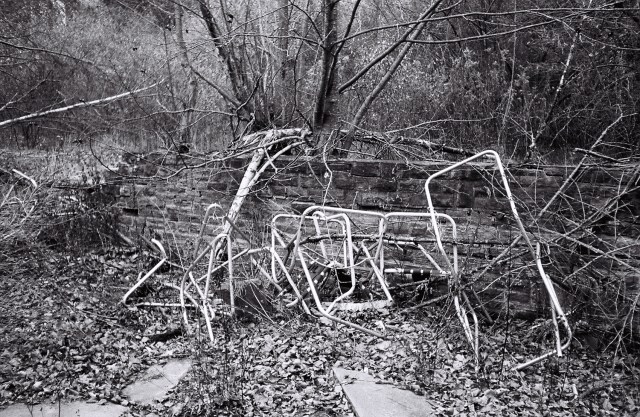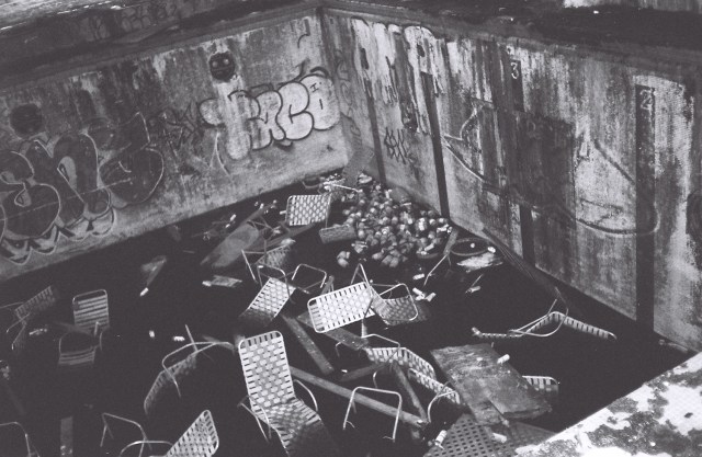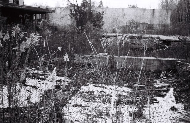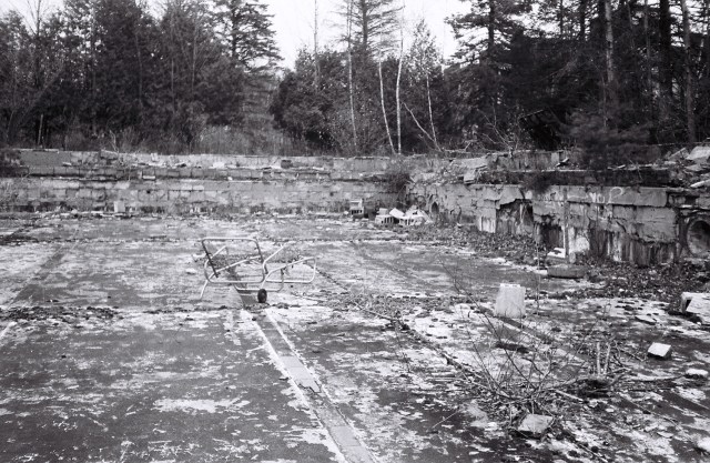 On our second visit to Grossinger, we explored the buildings with hotel rooms in greater detail, looking into each room and seeing what may have been left behind. This time around we found the outdoor pool and iceskating rink. We were sometimes restricted by unstable floors and at times we went pretty high up we didn’t want to risk falling through. Some building we didn’t even go into because they looked so caved-in. Every time we went back we saw something new. The third time back at Grossinger we went down to the basement of the pool where we found the showers and sauna. We also found the bar, which had been pretty much destroyed at that point.