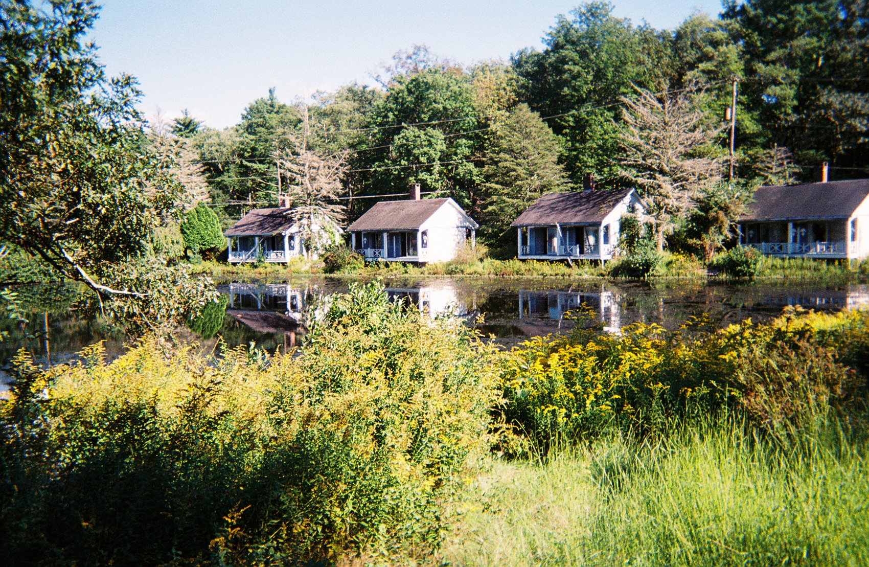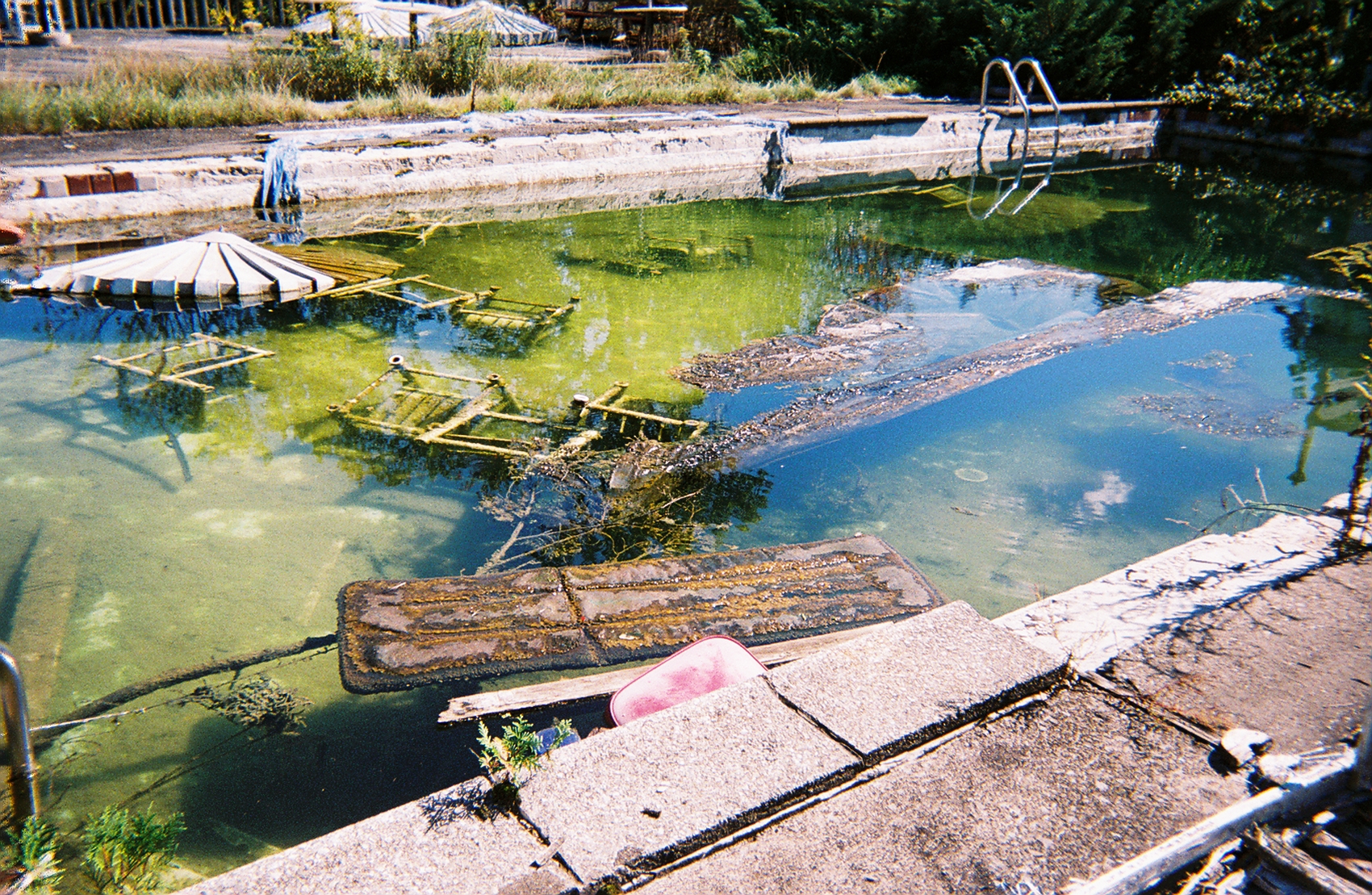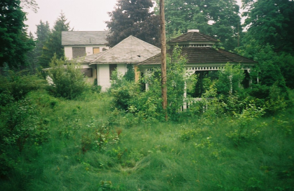 When we arrived at Birchwood, we noticed that the resort was on both sides of the road and there were no gates. We started on the left side of the road and entered the first building. It was easy to get inside because all of the doors were open. We found ourselves in the old bar/restaurant where there was graffiti all over the walls and the structural integrity had fallen into decay. Some reminiscence remained such as a grand piano, bar stools and tables. One thing we saw that was particularly creepy was a satanic star symbol made of salt on the floor of the bar. I was careful not to disturb it in order to avoid being cursed or haunted. Outside behind the building was an outdoor swimming pool filled with lawn chairs and umbrellas. We even saw little tadpoles swimming around. Past the swimming pool we crossed the tall grass towards the cabins surrounding a pond.