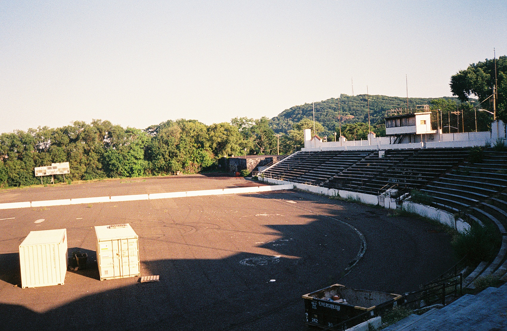 We found an entry from the parking lot wedged between a gate and a wall, which led us down a short path through the woods into the stadium. In the distance was a lovely view of green mountains and the bleachers were all overgrown with wild vegetation. The place had a grandeur feeling, especially when you are all the way at the top in this empty, abandoned stadium.