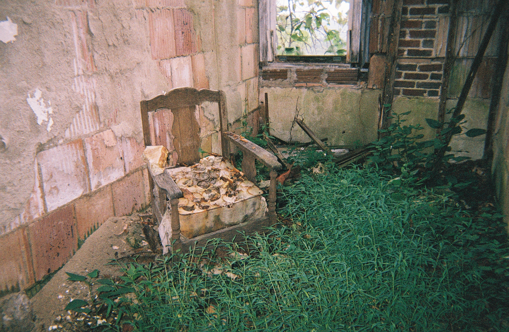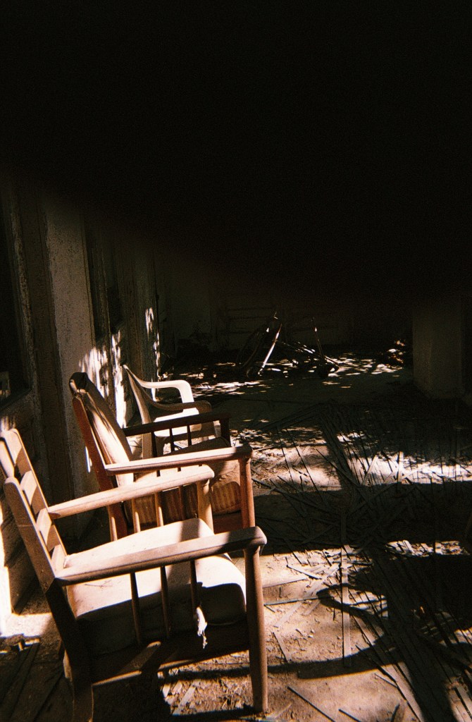 At first we tried entering from the back of the building, on the side closest to the road, but only came to dead ends. Then we started to go around the building and found a hole in the fence where we could easily enter the property. From the front and side of the building, we found plenty of open doors and windows that lead inside. We stayed on the first floor for a while, exploring the layout. Some rooms were completely taken over by nature while others appeared to be untouched for a while. Around the corner was an indoor porch with a wooden rocking chair in surprisingly good condition. I had the feeling that this chair held a lot of history and I wondered about those who had rocked in this chair long ago.