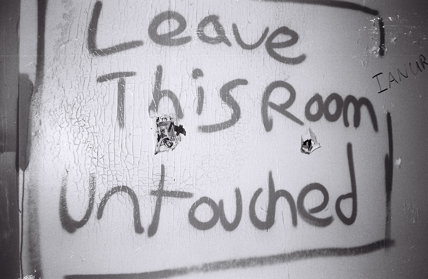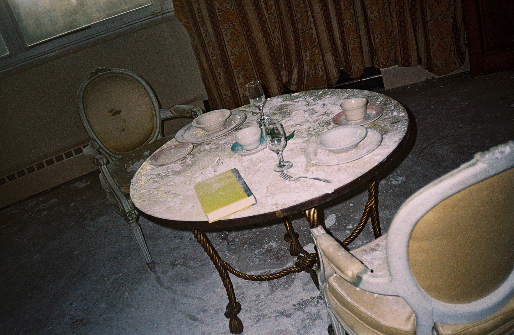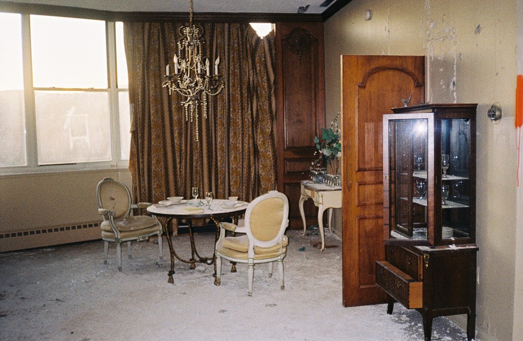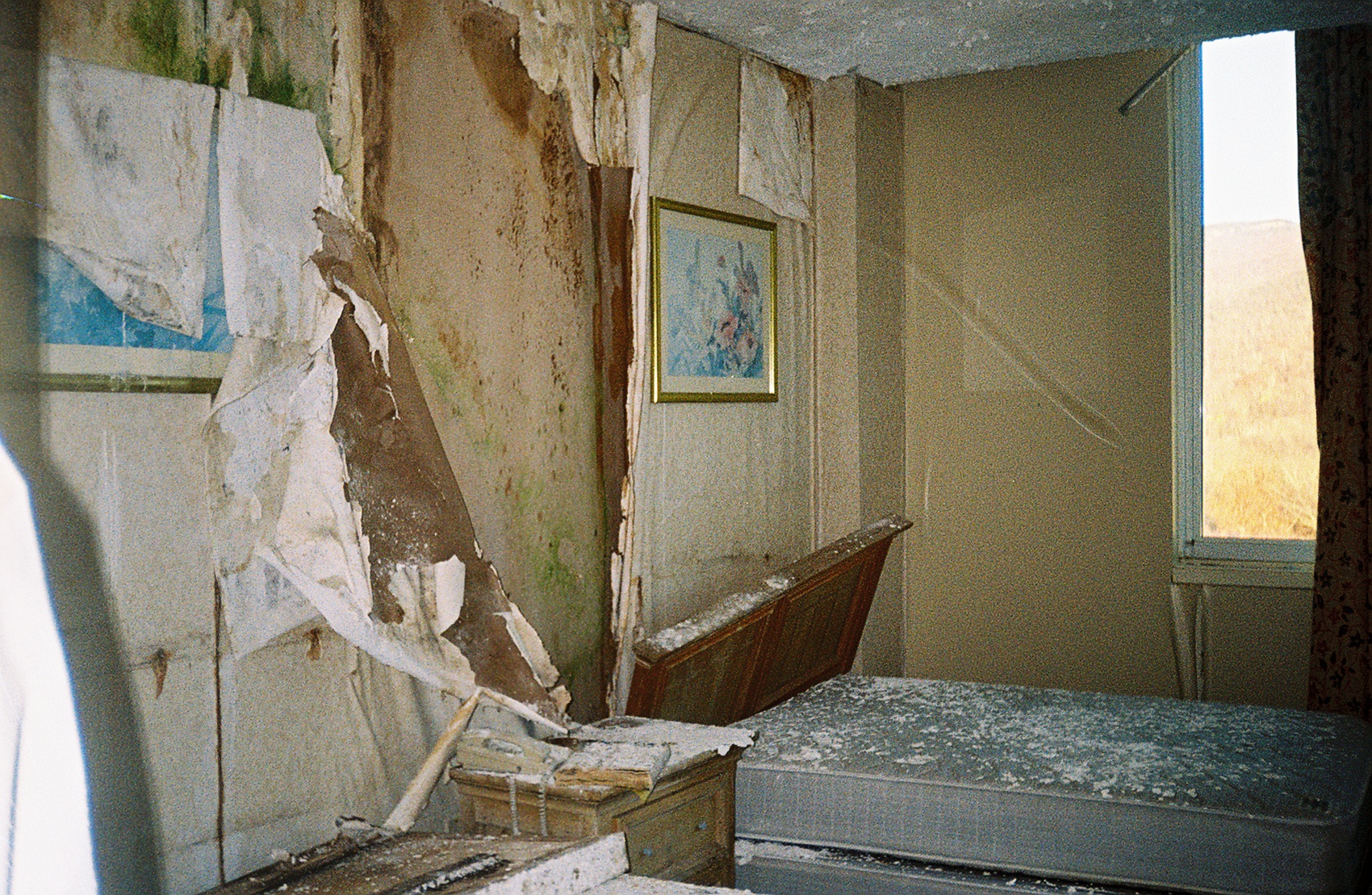 The second time that we explored Nevele we went into the tower. We took the stairs all the way up to the rooftop and looked out at the view. It was circular and we could see the entire complex and mountains all around us. While every floor layout followed the same format of a long hallway lined with identical bedrooms, the top floor was special. We entered what seemed to be the presidential suit which was partly decayed but strangely pristine at the same time. There were two chairs and a table set with glasses and plates. Above the table was an ornate chandelier with candles and beads and behind that was a window looking out on the mountainous view with thick decorative curtains. In the corner was an end table with flowers and on the other side was a cabinet with glass doors and plates and glasses still inside. It looked grand and of another time. We figured that previous visitors had kept the dining area intact and appeared to be just as it was before it became abandoned. When we returned the 3rd time, someone had spray painted, “Leave this room untouched,” confirming our theory that it had been left alone intentionally.