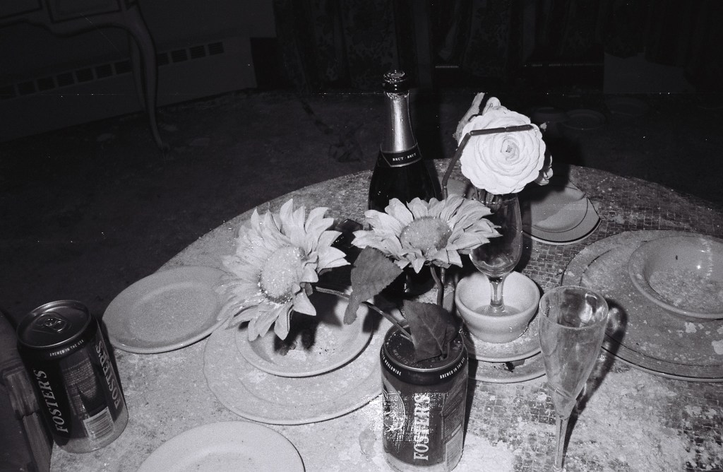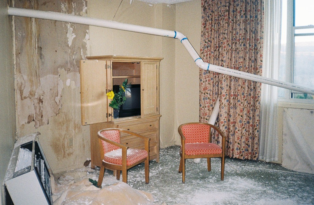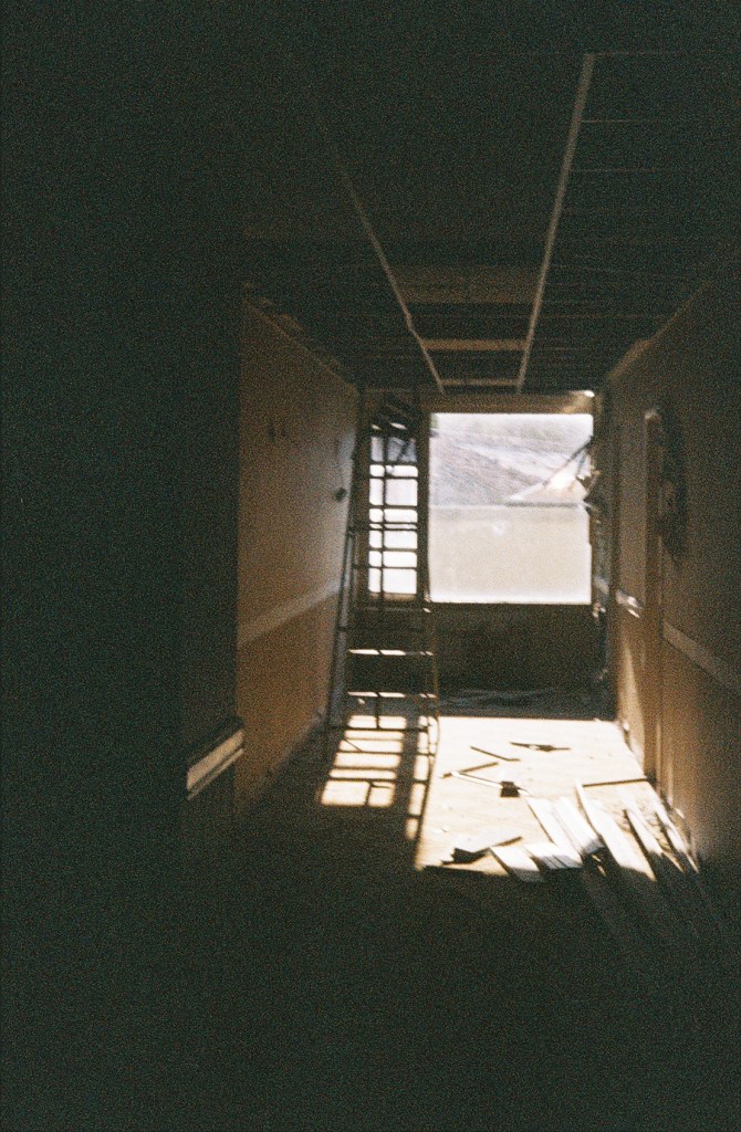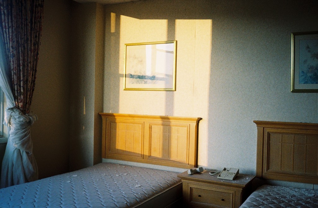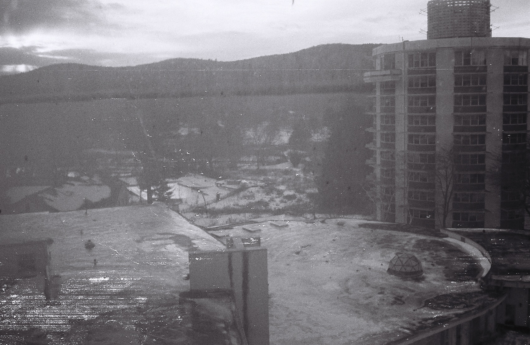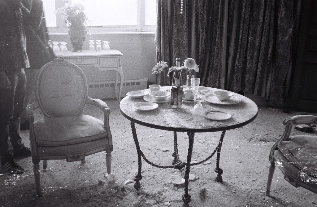 The second time that we explored Nevele we went into the tower. We took the stairs all the way up to the rooftop and looked out at the view. It was circular and we could see the entire complex and mountains all around us. While every floor layout followed the same format of a long hallway lined with identical bedrooms, the top floor was special. We entered what seemed to be the presidential suit which was partly decayed but strangely pristine at the same time. There were two chairs and a table set with glasses and plates. Above the table was an ornate chandelier with candles and beads and behind that was a window looking out on the mountainous view with thick decorative curtains. In the corner was an end table with flowers and on the other side was a cabinet with glass doors and plates and glasses still inside. It looked grand and of another time. We figured that previous visitors had kept the dining area intact and appeared to be just as it was before it became abandoned. When we returned the 3rd time, someone had spray painted, “Leave this room untouched,” confirming our theory that it had been left alone intentionally.