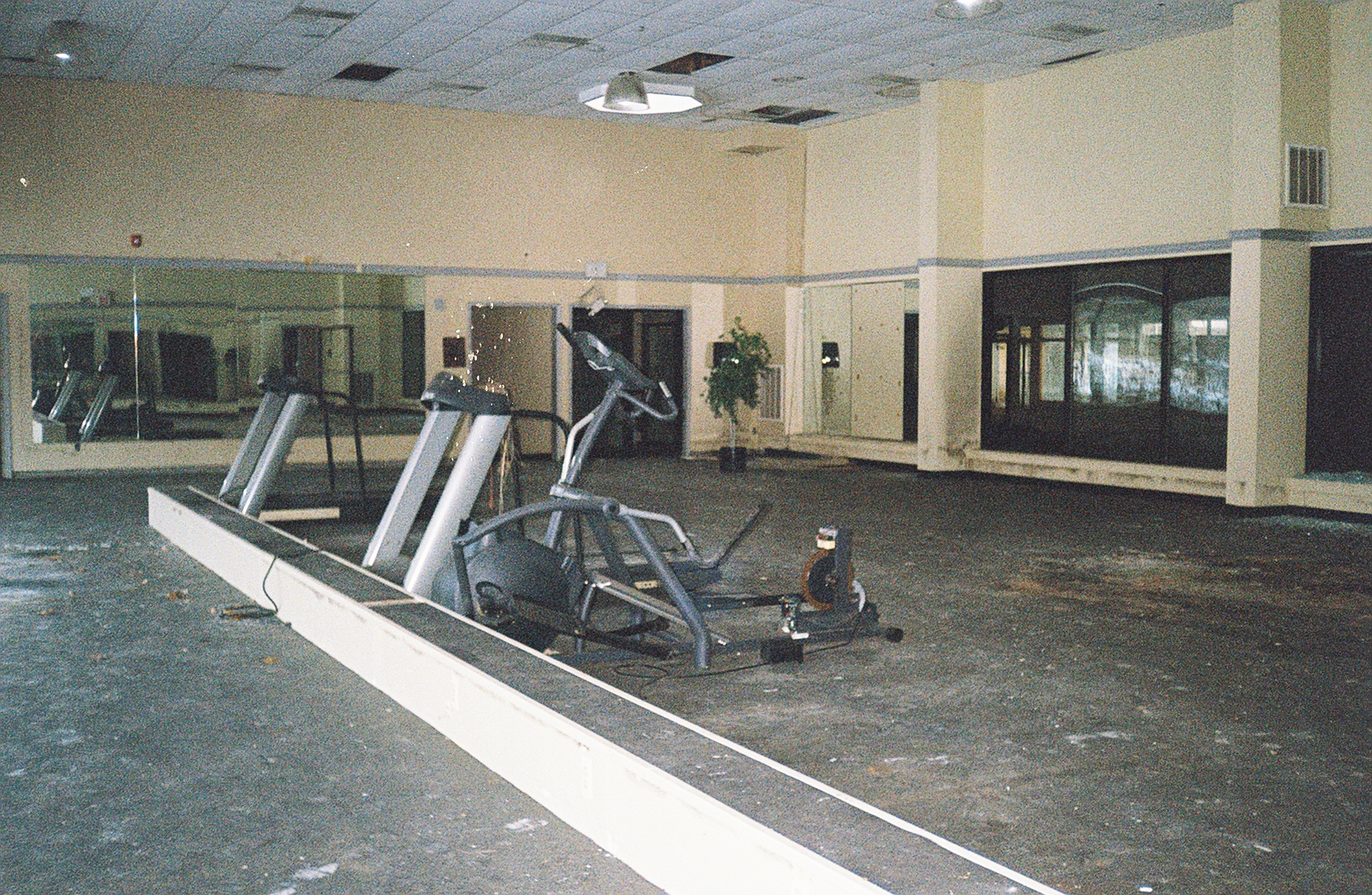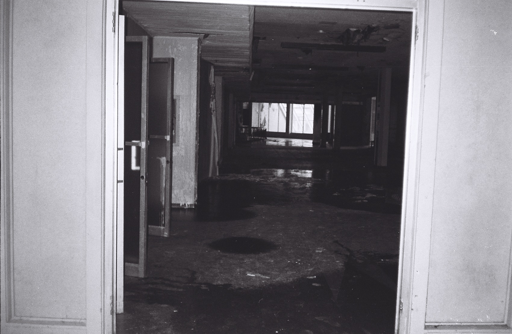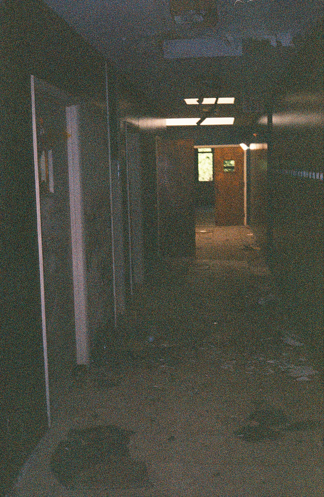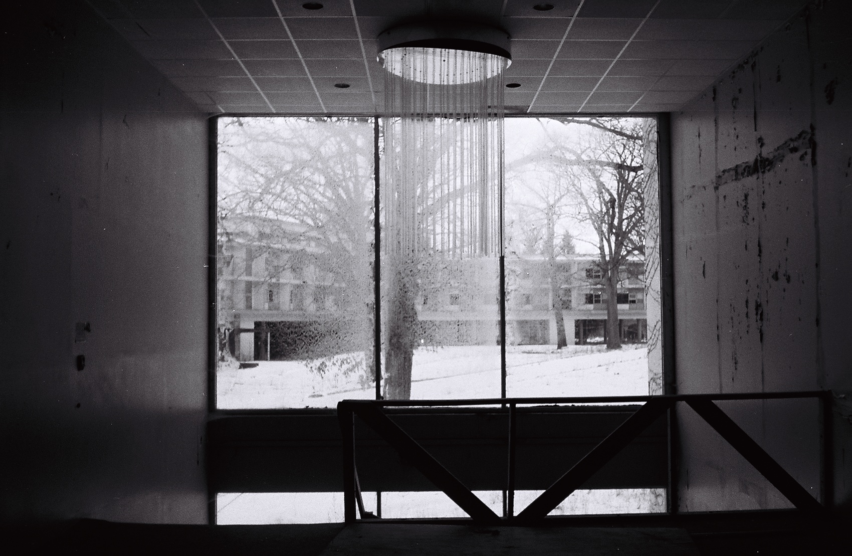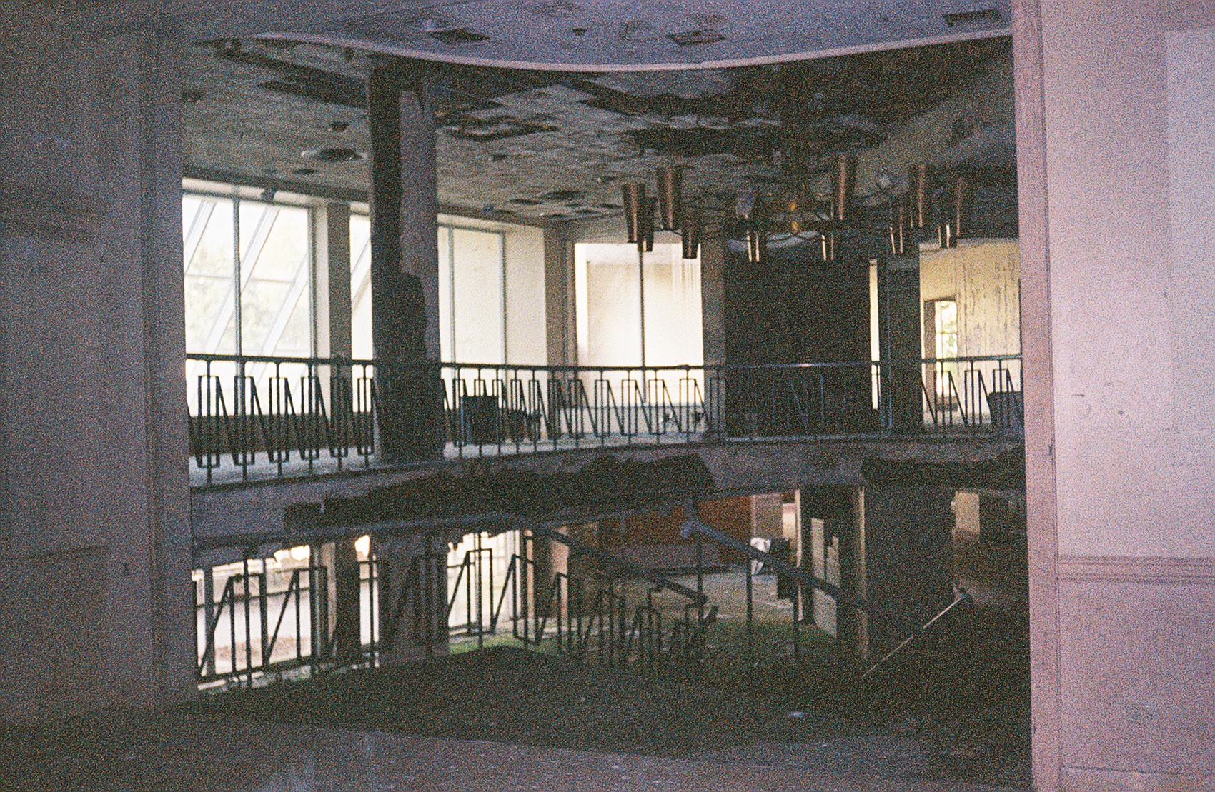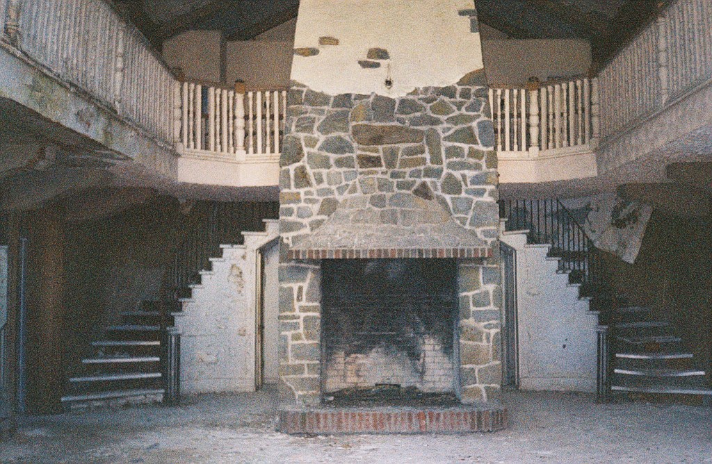 We got in through an opening in the fence and walked through the woods to a bridge. The bridge looked like it had seen better days but we decide to trust it anyways since it was the only way to cross the river. Once over the bridge, we were no longer in the woods. Next to us was a pond and on the other side of pond is the property. We walked around the pond until we got to a ditch with an industrial halfpipe sticking out. We climb over the ditch and find remnants of a road that used to exist and leads to the property. Down the road on the left was a small outdoor swimming pool and tennis courts and on the right was a children’s day care. This is the first building we entered. The daycare was pretty bad shape – colorful paint was pealing off the walls, the ground was wet and in some areas the floor was completely caved in. We continued down the road to the main area where the tower was. The next building we visited was where the old reception hall used to be. We entered through what looked to be the old lobby. The glass door had been shattered and only the door frame remained. We walked from the lobby into the grand reception hall, lined with ceiling to floor glass windows, half of which were shattered, the carpet was wet and degraded but sturdy enough for us to make our way through, The room was practically empty other than a couple of tables left over and tattered curtains. Then we went upstairs to a hallway lined with hotel rooms. Something that really freaked me out was the posters on the walls. The posters were of different men pointing guns and we found 3 or 4 of them in all. The gaze and directness of the photographs seemed so real and felt like a warning sign. We explored one more building before leaving. This we like to refer to as the porn house, since it is full of old porn magazines and heroin needles. It had high ceilings, a big fire place in the center of the room and spiral staircases on either side of the fire place that led to the 2nd floor. There was a painting left behind of a sun and a tree, but it was too big to take it with us so we left it in the fireplace to pick it up next time. Unfortunately it was gone by then.