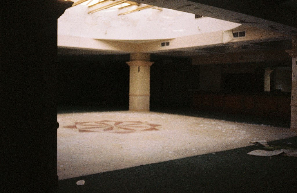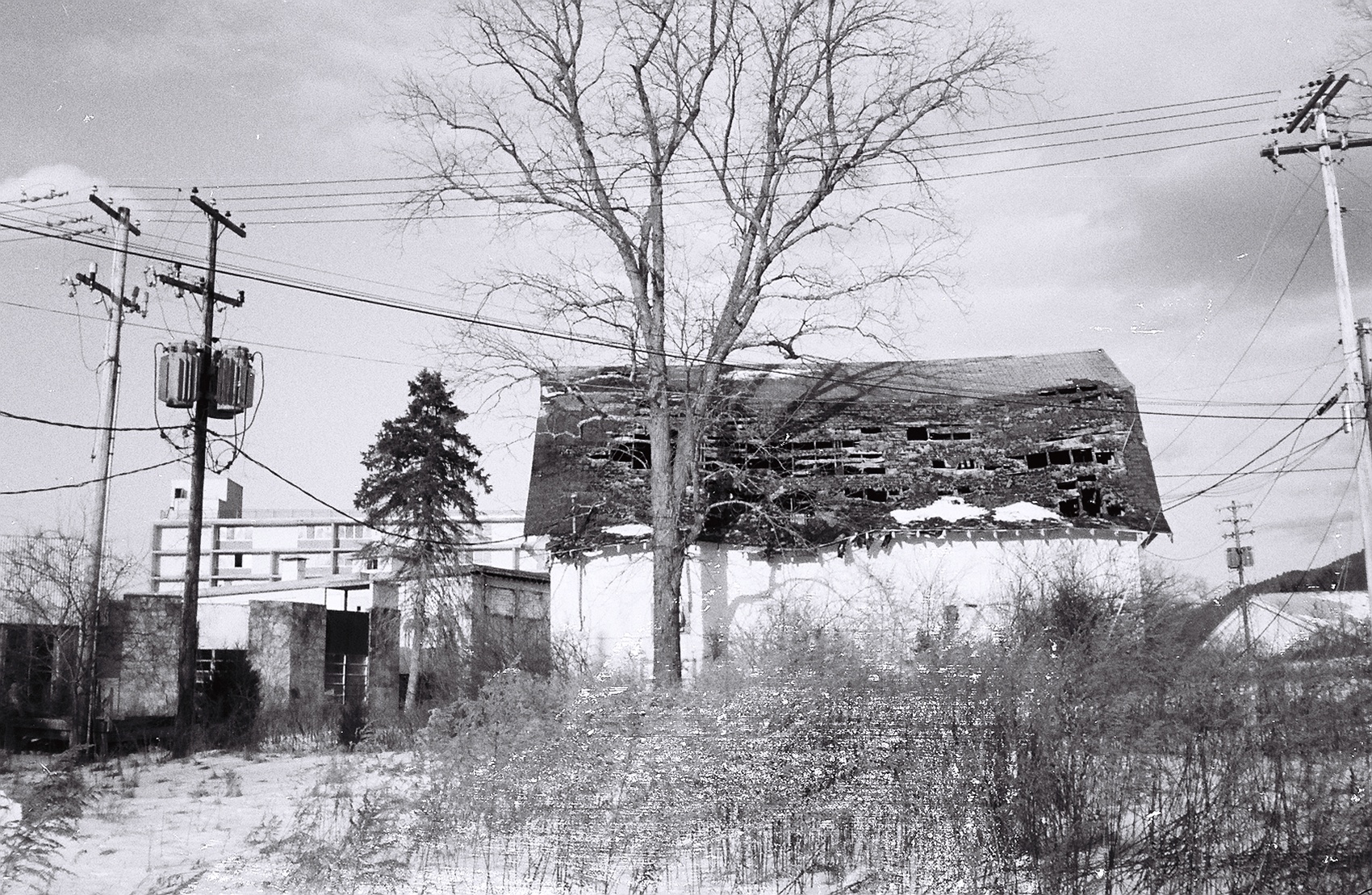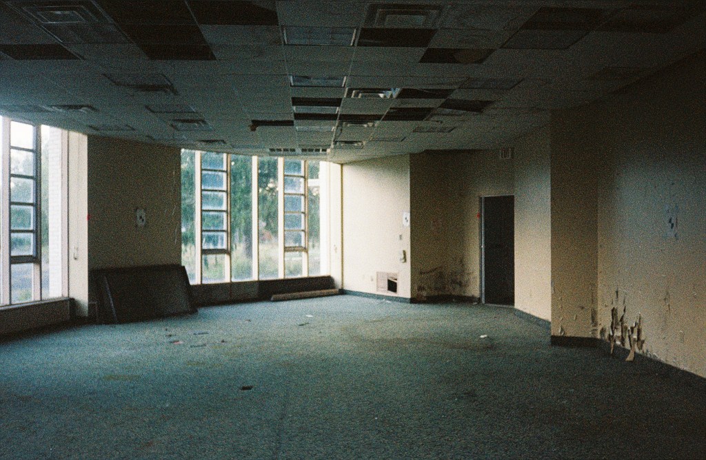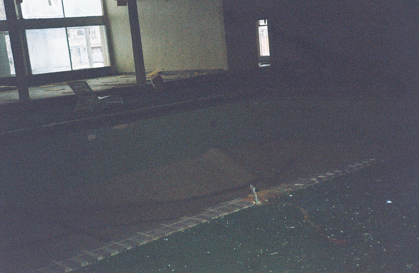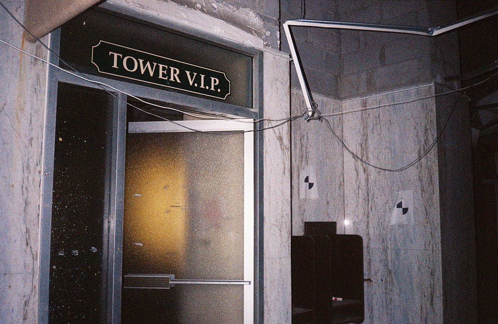 We got in through an opening in the fence and walked through the woods to a bridge. The bridge looked like it had seen better days but we decide to trust it anyways since it was the only way to cross the river. Once over the bridge, we were no longer in the woods. Next to us was a pond and on the other side of pond is the property. We walked around the pond until we got to a ditch with an industrial halfpipe sticking out. We climb over the ditch and find remnants of a road that used to exist and leads to the property. Down the road on the left was a small outdoor swimming pool and tennis courts and on the right was a children’s day care. This is the first building we entered. The daycare was pretty bad shape – colorful paint was pealing off the walls, the ground was wet and in some areas the floor was completely caved in. We continued down the road to the main area where the tower was. The next building we visited was where the old reception hall used to be. We entered through what looked to be the old lobby. The glass door had been shattered and only the door frame remained. We walked from the lobby into the grand reception hall, lined with ceiling to floor glass windows, half of which were shattered, the carpet was wet and degraded but sturdy enough for us to make our way through, The room was practically empty other than a couple of tables left over and tattered curtains. Then we went upstairs to a hallway lined with hotel rooms. Something that really freaked me out was the posters on the walls. The posters were of different men pointing guns and we found 3 or 4 of them in all. The gaze and directness of the photographs seemed so real and felt like a warning sign. We explored one more building before leaving. This we like to refer to as the porn house, since it is full of old porn magazines and heroin needles. It had high ceilings, a big fire place in the center of the room and spiral staircases on either side of the fire place that led to the 2nd floor. There was a painting left behind of a sun and a tree, but it was too big to take it with us so we left it in the fireplace to pick it up next time. Unfortunately it was gone by then.