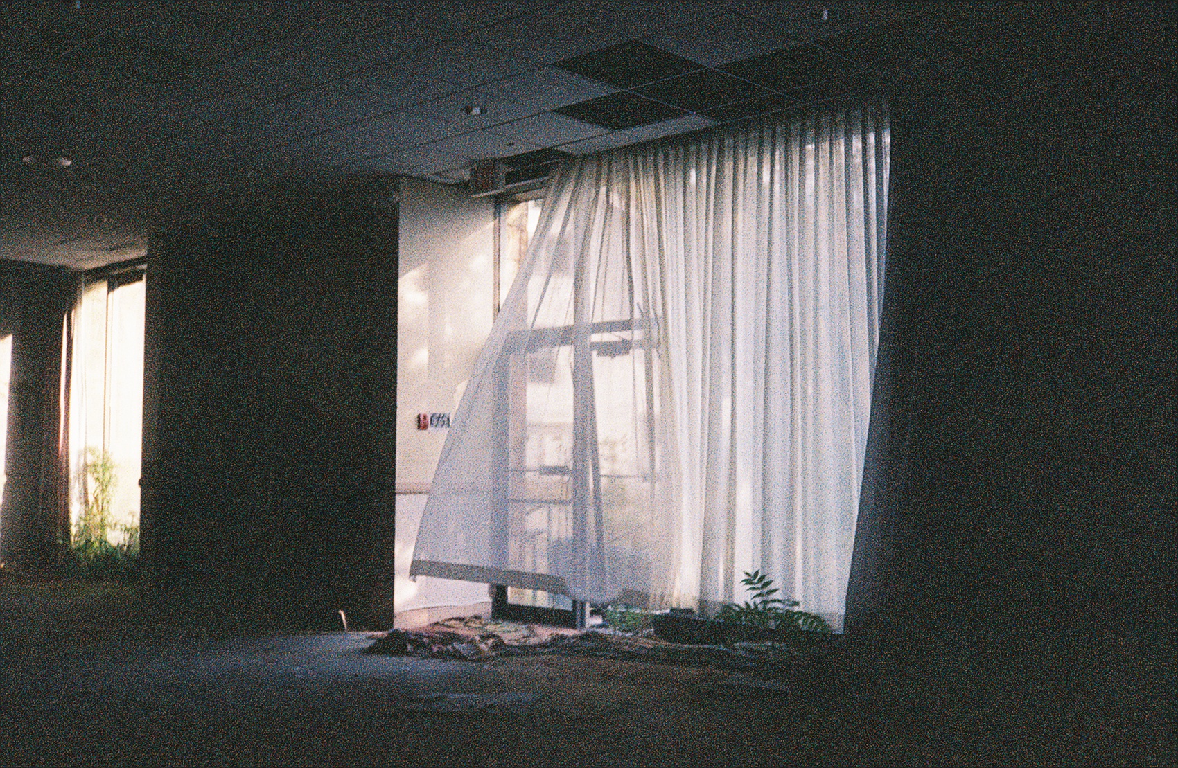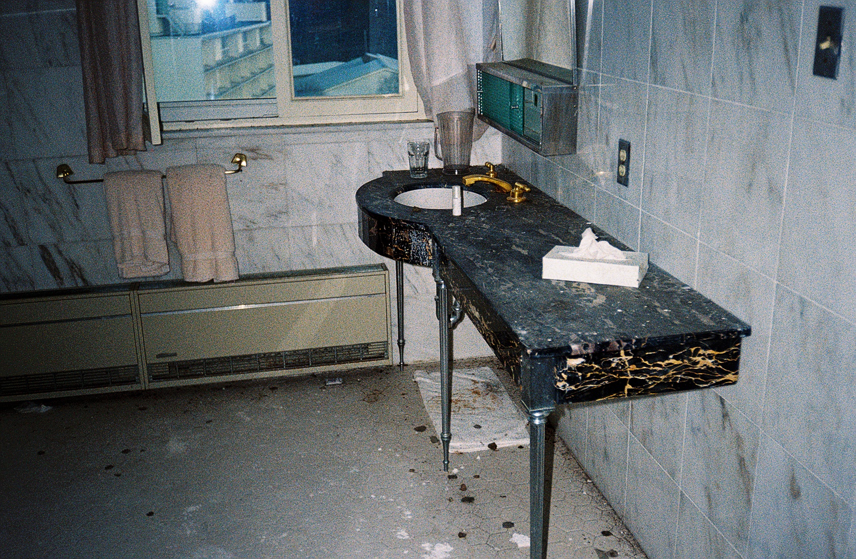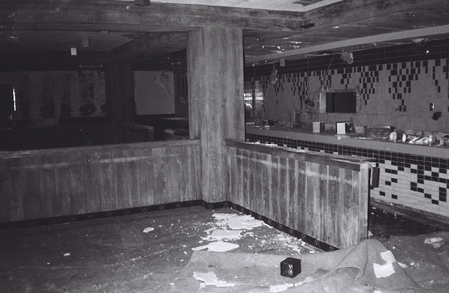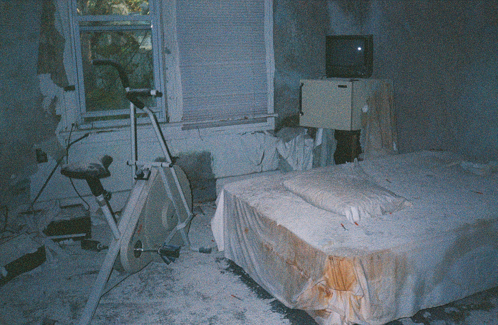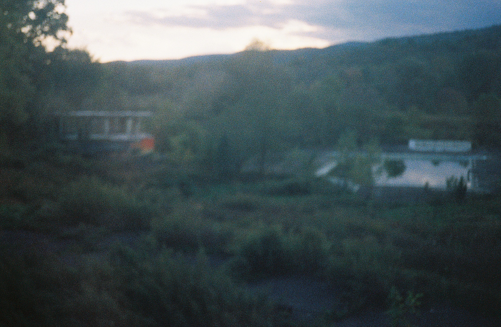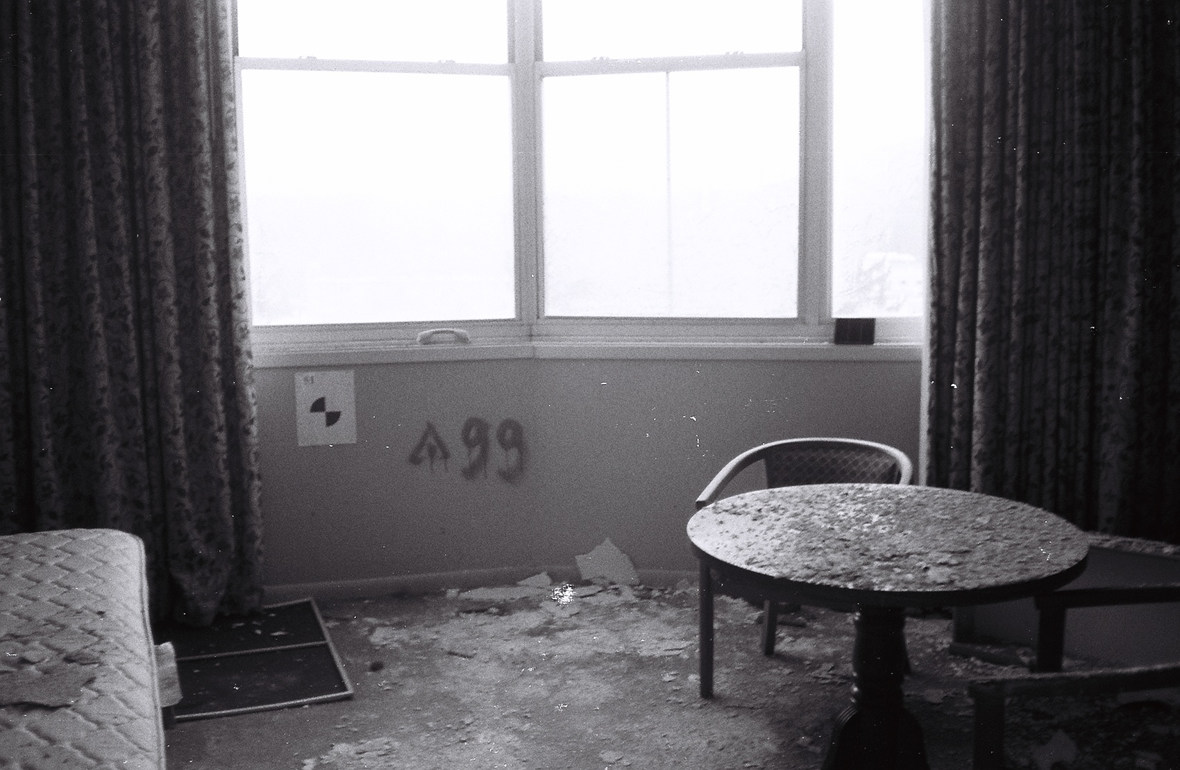 We got in through an opening in the fence and walked through the woods to a bridge. The bridge looked like it had seen better days but we decide to trust it anyways since it was the only way to cross the river. Once over the bridge, we were no longer in the woods. Next to us was a pond and on the other side of pond is the property. We walked around the pond until we got to a ditch with an industrial halfpipe sticking out. We climb over the ditch and find remnants of a road that used to exist and leads to the property. Down the road on the left was a small outdoor swimming pool and tennis courts and on the right was a children’s day care. This is the first building we entered. The daycare was pretty bad shape – colorful paint was pealing off the walls, the ground was wet and in some areas the floor was completely caved in. We continued down the road to the main area where the tower was. The next building we visited was where the old reception hall used to be. We entered through what looked to be the old lobby. The glass door had been shattered and only the door frame remained. We walked from the lobby into the grand reception hall, lined with ceiling to floor glass windows, half of which were shattered, the carpet was wet and degraded but sturdy enough for us to make our way through, The room was practically empty other than a couple of tables left over and tattered curtains. Then we went upstairs to a hallway lined with hotel rooms. Something that really freaked me out was the posters on the walls. The posters were of different men pointing guns and we found 3 or 4 of them in all. The gaze and directness of the photographs seemed so real and felt like a warning sign. We explored one more building before leaving. This we like to refer to as the porn house, since it is full of old porn magazines and heroin needles. It had high ceilings, a big fire place in the center of the room and spiral staircases on either side of the fire place that led to the 2nd floor. There was a painting left behind of a sun and a tree, but it was too big to take it with us so we left it in the fireplace to pick it up next time. Unfortunately it was gone by then.