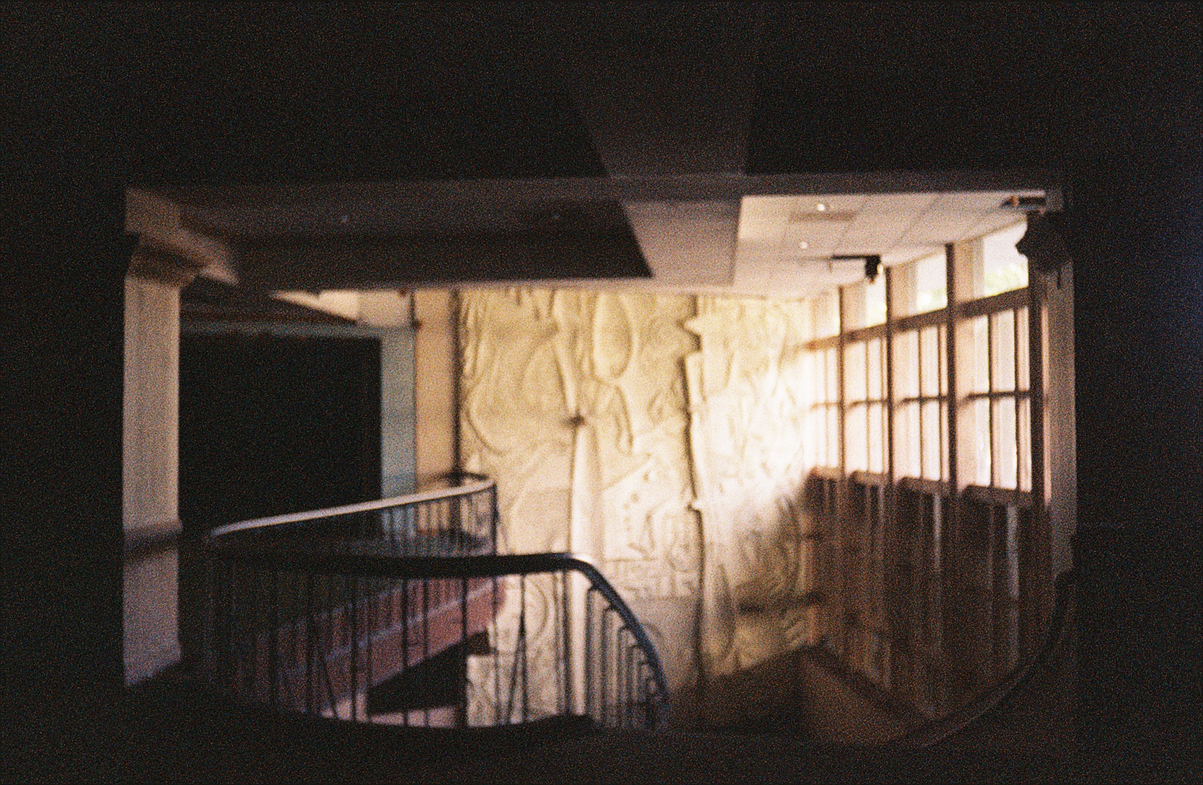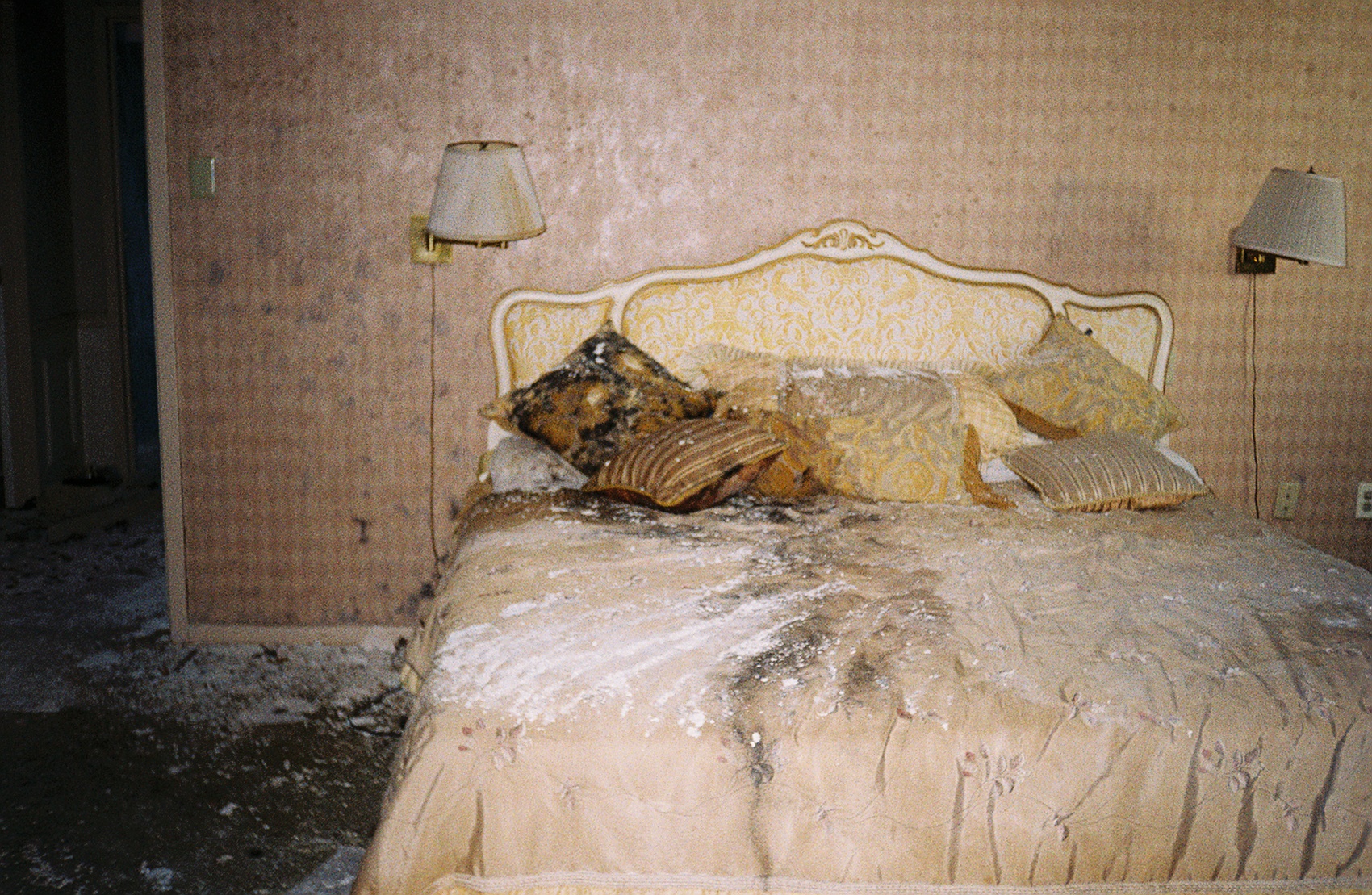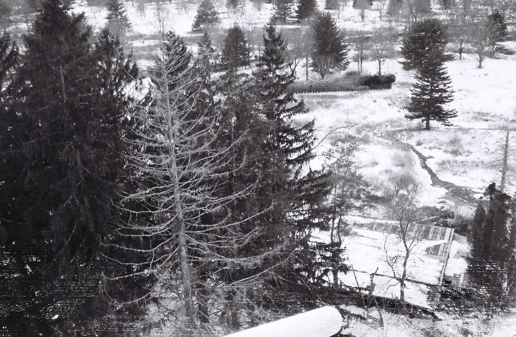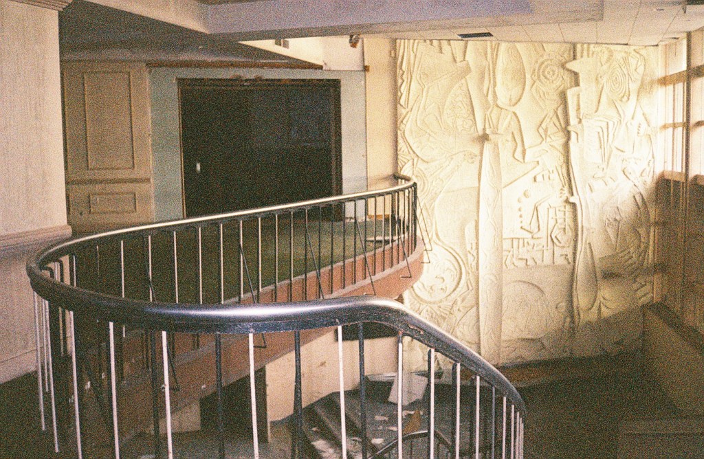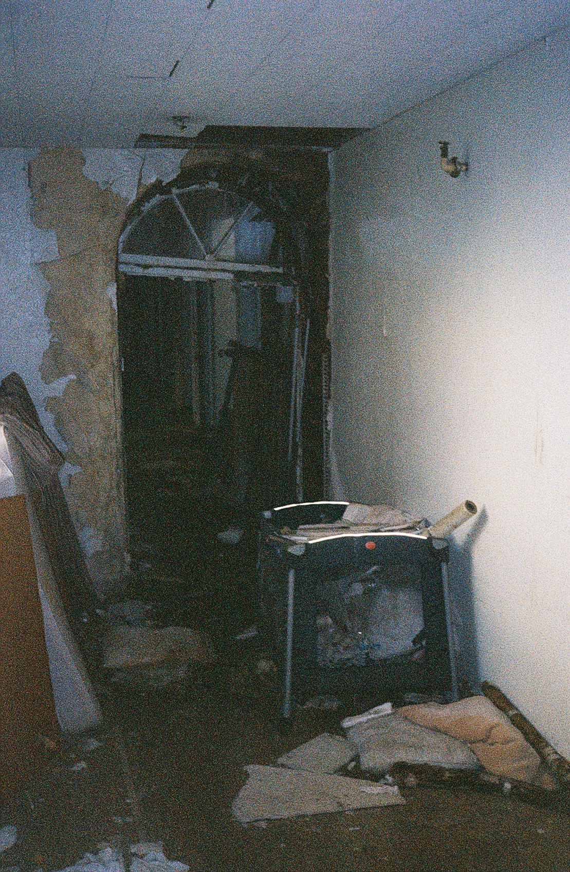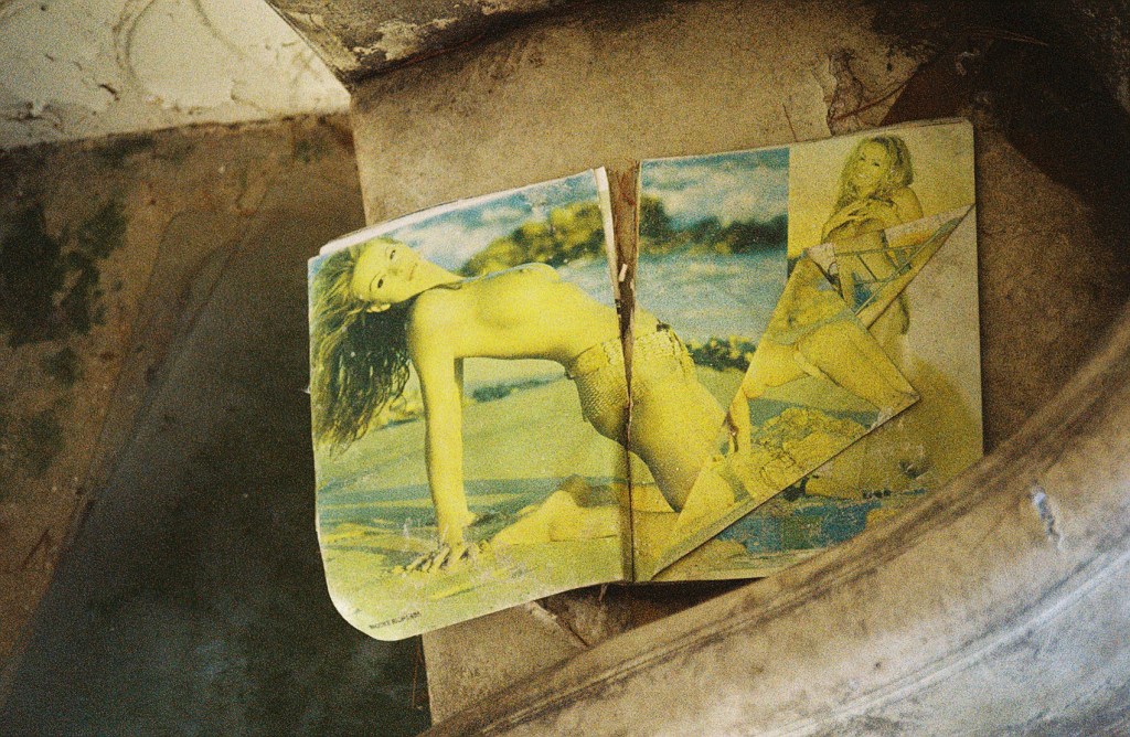 We got in through an opening in the fence and walked through the woods to a bridge. The bridge looked like it had seen better days but we decide to trust it anyways since it was the only way to cross the river. Once over the bridge, we were no longer in the woods. Next to us was a pond and on the other side of pond is the property. We walked around the pond until we got to a ditch with an industrial halfpipe sticking out. We climb over the ditch and find remnants of a road that used to exist and leads to the property. Down the road on the left was a small outdoor swimming pool and tennis courts and on the right was a children’s day care. This is the first building we entered. The daycare was pretty bad shape – colorful paint was pealing off the walls, the ground was wet and in some areas the floor was completely caved in. We continued down the road to the main area where the tower was. The next building we visited was where the old reception hall used to be. We entered through what looked to be the old lobby. The glass door had been shattered and only the door frame remained. We walked from the lobby into the grand reception hall, lined with ceiling to floor glass windows, half of which were shattered, the carpet was wet and degraded but sturdy enough for us to make our way through, The room was practically empty other than a couple of tables left over and tattered curtains. Then we went upstairs to a hallway lined with hotel rooms. Something that really freaked me out was the posters on the walls. The posters were of different men pointing guns and we found 3 or 4 of them in all. The gaze and directness of the photographs seemed so real and felt like a warning sign. We explored one more building before leaving. This we like to refer to as the porn house, since it is full of old porn magazines and heroin needles. It had high ceilings, a big fire place in the center of the room and spiral staircases on either side of the fire place that led to the 2nd floor. There was a painting left behind of a sun and a tree, but it was too big to take it with us so we left it in the fireplace to pick it up next time. Unfortunately it was gone by then.