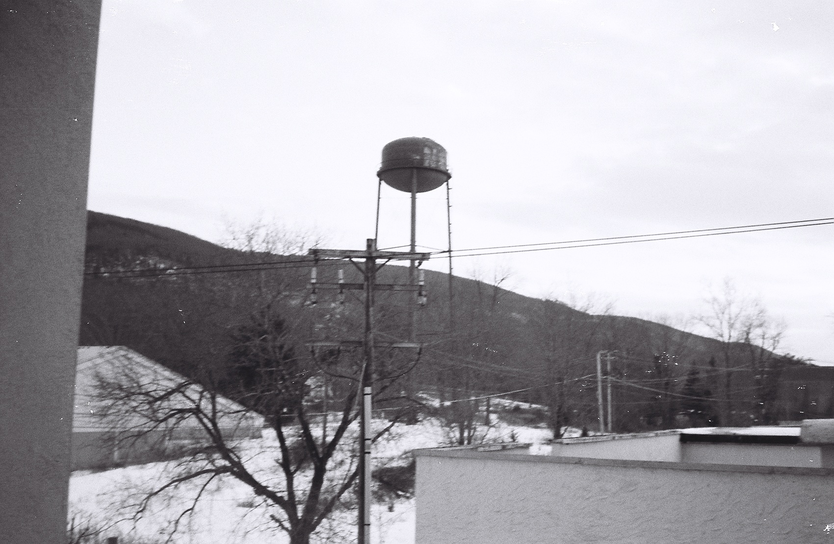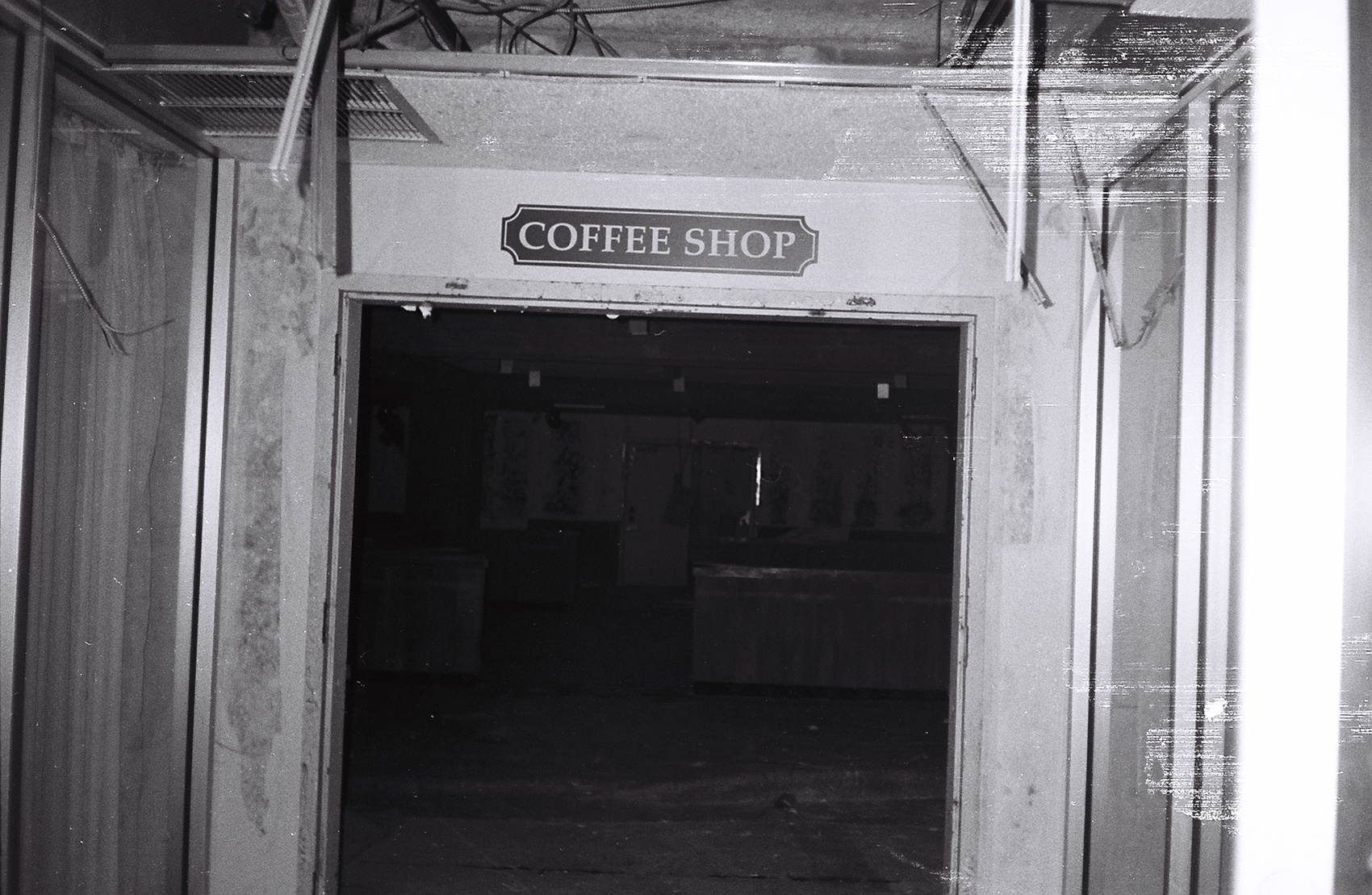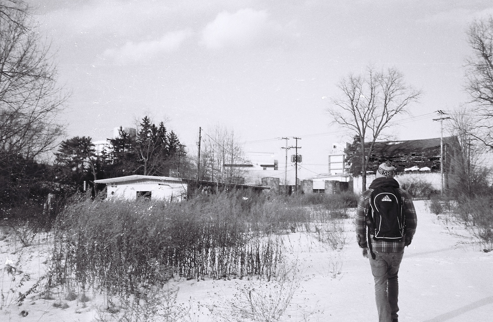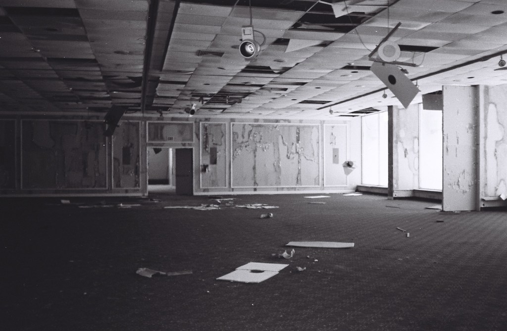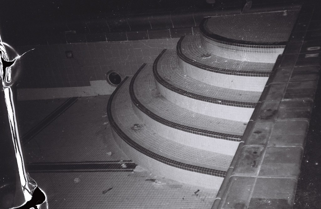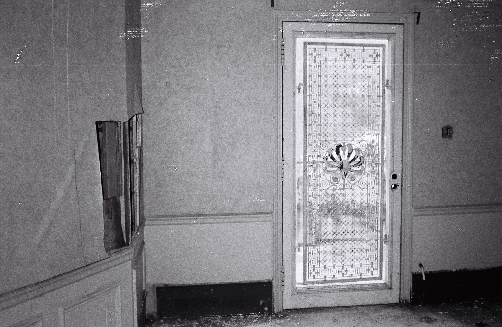 We got in through an opening in the fence and walked through the woods to a bridge. The bridge looked like it had seen better days but we decide to trust it anyways since it was the only way to cross the river. Once over the bridge, we were no longer in the woods. Next to us was a pond and on the other side of pond is the property. We walked around the pond until we got to a ditch with an industrial halfpipe sticking out. We climb over the ditch and find remnants of a road that used to exist and leads to the property. Down the road on the left was a small outdoor swimming pool and tennis courts and on the right was a children’s day care. This is the first building we entered. The daycare was pretty bad shape – colorful paint was pealing off the walls, the ground was wet and in some areas the floor was completely caved in. We continued down the road to the main area where the tower was. The next building we visited was where the old reception hall used to be. We entered through what looked to be the old lobby. The glass door had been shattered and only the door frame remained. We walked from the lobby into the grand reception hall, lined with ceiling to floor glass windows, half of which were shattered, the carpet was wet and degraded but sturdy enough for us to make our way through, The room was practically empty other than a couple of tables left over and tattered curtains. Then we went upstairs to a hallway lined with hotel rooms. Something that really freaked me out was the posters on the walls. The posters were of different men pointing guns and we found 3 or 4 of them in all. The gaze and directness of the photographs seemed so real and felt like a warning sign. We explored one more building before leaving. This we like to refer to as the porn house, since it is full of old porn magazines and heroin needles. It had high ceilings, a big fire place in the center of the room and spiral staircases on either side of the fire place that led to the 2nd floor. There was a painting left behind of a sun and a tree, but it was too big to take it with us so we left it in the fireplace to pick it up next time. Unfortunately it was gone by then.