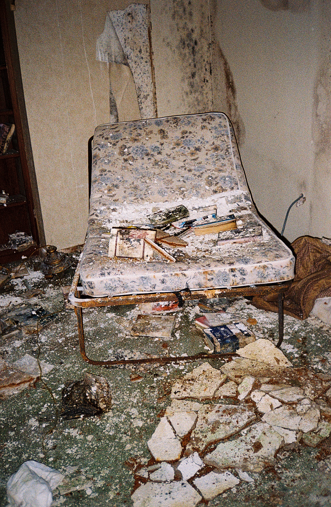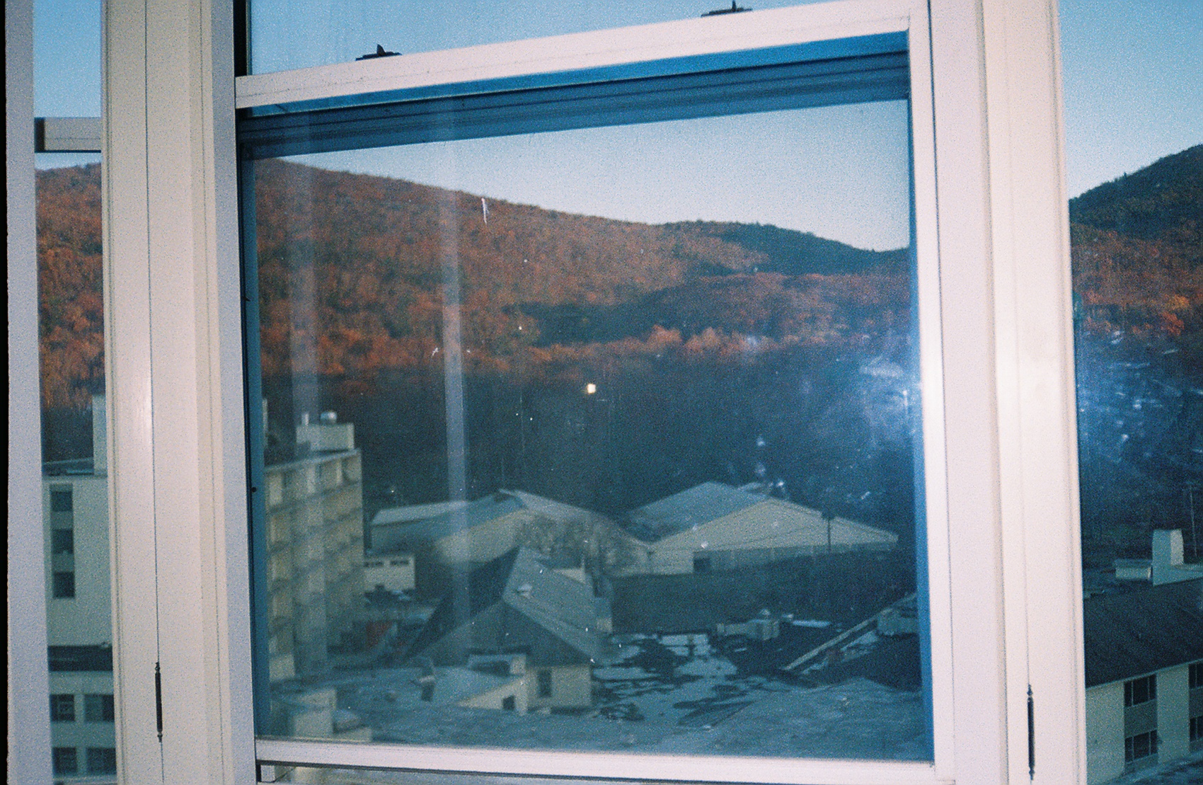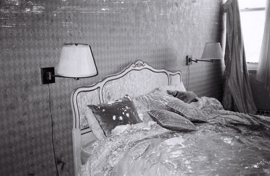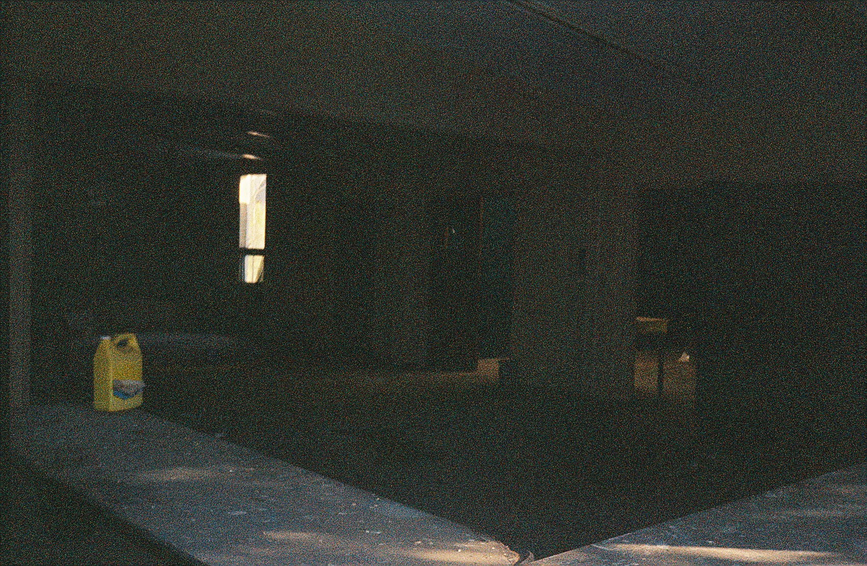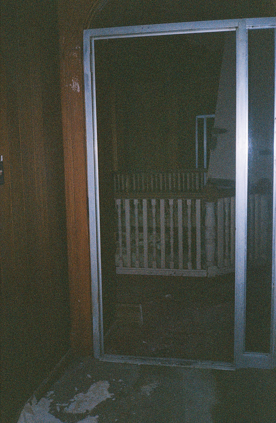 We got in through an opening in the fence and walked through the woods to a bridge. The bridge looked like it had seen better days but we decide to trust it anyways since it was the only way to cross the river. Once over the bridge, we were no longer in the woods. Next to us was a pond and on the other side of pond is the property. We walked around the pond until we got to a ditch with an industrial halfpipe sticking out. We climb over the ditch and find remnants of a road that used to exist and leads to the property. Down the road on the left was a small outdoor swimming pool and tennis courts and on the right was a children’s day care. This is the first building we entered. The daycare was pretty bad shape – colorful paint was pealing off the walls, the ground was wet and in some areas the floor was completely caved in. We continued down the road to the main area where the tower was. The next building we visited was where the old reception hall used to be. We entered through what looked to be the old lobby. The glass door had been shattered and only the door frame remained. We walked from the lobby into the grand reception hall, lined with ceiling to floor glass windows, half of which were shattered, the carpet was wet and degraded but sturdy enough for us to make our way through, The room was practically empty other than a couple of tables left over and tattered curtains. Then we went upstairs to a hallway lined with hotel rooms. Something that really freaked me out was the posters on the walls. The posters were of different men pointing guns and we found 3 or 4 of them in all. The gaze and directness of the photographs seemed so real and felt like a warning sign. We explored one more building before leaving. This we like to refer to as the porn house, since it is full of old porn magazines and heroin needles. It had high ceilings, a big fire place in the center of the room and spiral staircases on either side of the fire place that led to the 2nd floor. There was a painting left behind of a sun and a tree, but it was too big to take it with us so we left it in the fireplace to pick it up next time. Unfortunately it was gone by then.