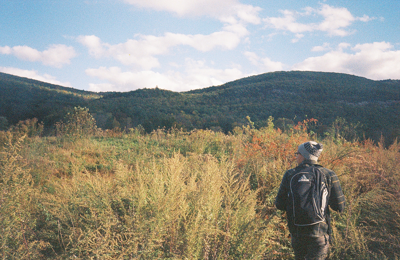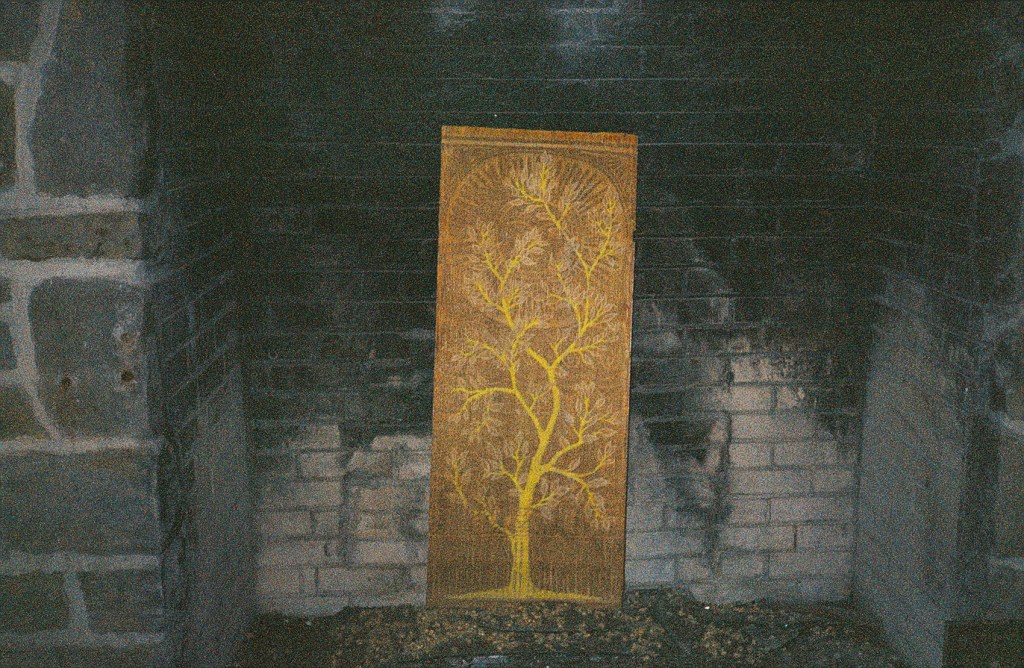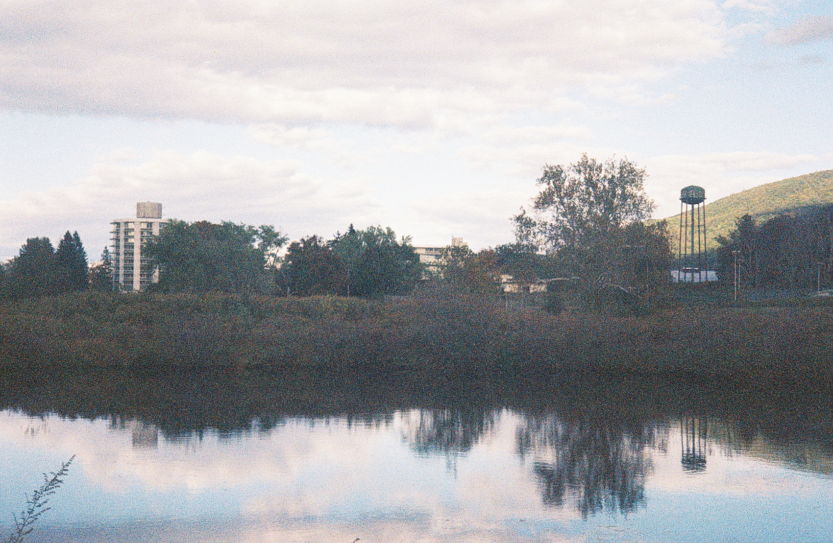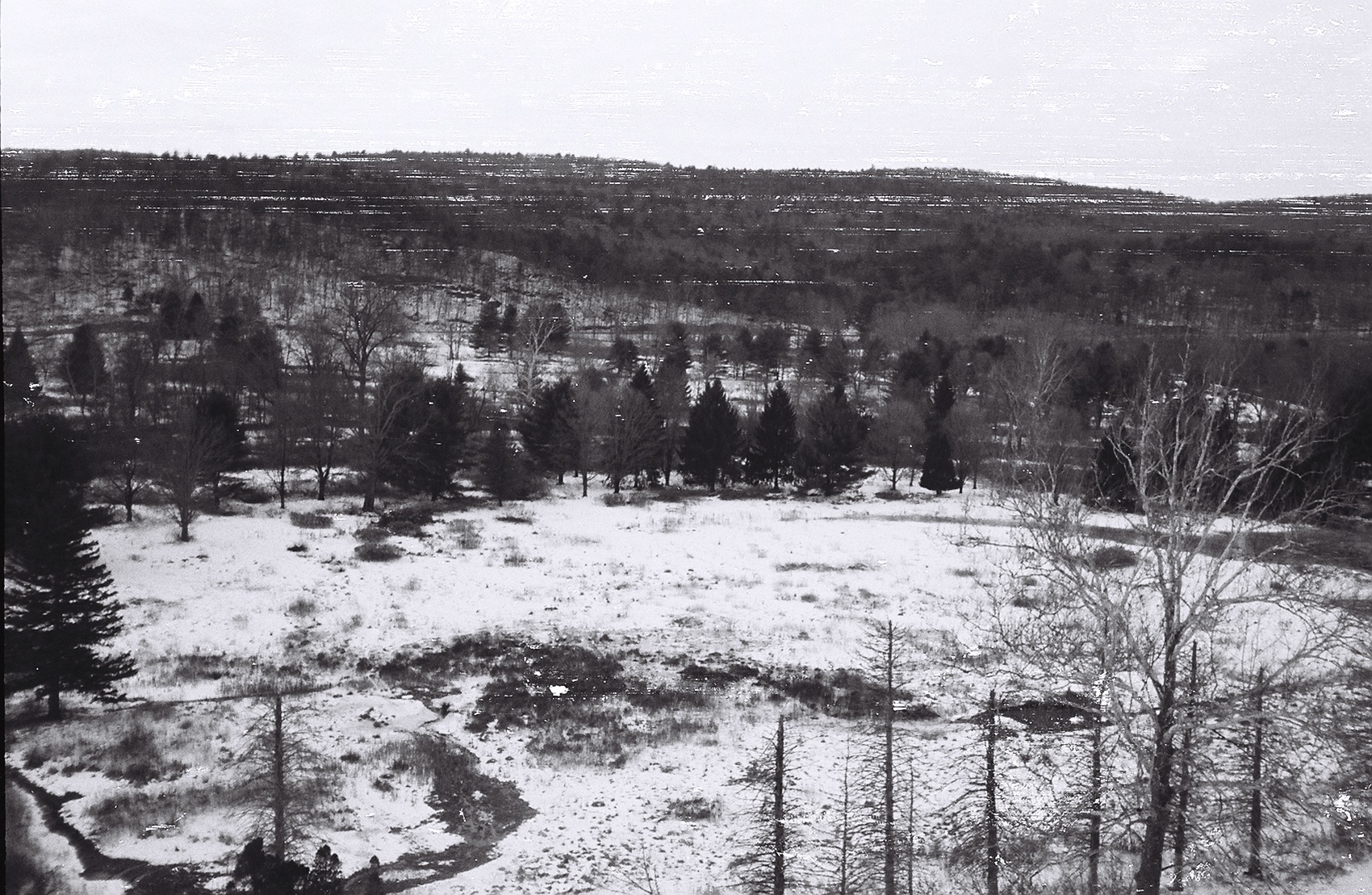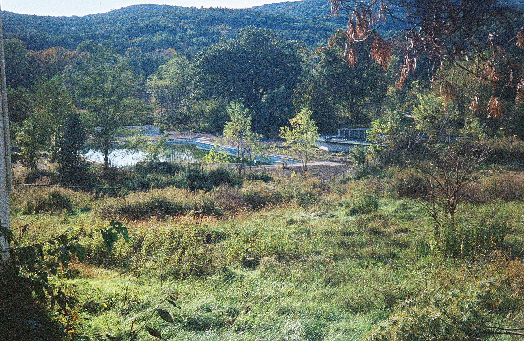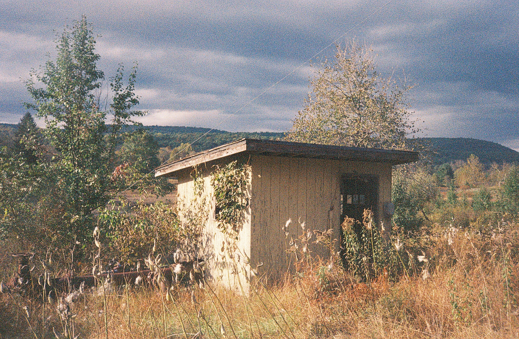 We got in through an opening in the fence and walked through the woods to a bridge. The bridge looked like it had seen better days but we decide to trust it anyways since it was the only way to cross the river. Once over the bridge, we were no longer in the woods. Next to us was a pond and on the other side of pond is the property. We walked around the pond until we got to a ditch with an industrial halfpipe sticking out. We climb over the ditch and find remnants of a road that used to exist and leads to the property. Down the road on the left was a small outdoor swimming pool and tennis courts and on the right was a children’s day care. This is the first building we entered. The daycare was pretty bad shape – colorful paint was pealing off the walls, the ground was wet and in some areas the floor was completely caved in. We continued down the road to the main area where the tower was. The next building we visited was where the old reception hall used to be. We entered through what looked to be the old lobby. The glass door had been shattered and only the door frame remained. We walked from the lobby into the grand reception hall, lined with ceiling to floor glass windows, half of which were shattered, the carpet was wet and degraded but sturdy enough for us to make our way through, The room was practically empty other than a couple of tables left over and tattered curtains. Then we went upstairs to a hallway lined with hotel rooms. Something that really freaked me out was the posters on the walls. The posters were of different men pointing guns and we found 3 or 4 of them in all. The gaze and directness of the photographs seemed so real and felt like a warning sign. We explored one more building before leaving. This we like to refer to as the porn house, since it is full of old porn magazines and heroin needles. It had high ceilings, a big fire place in the center of the room and spiral staircases on either side of the fire place that led to the 2nd floor. There was a painting left behind of a sun and a tree, but it was too big to take it with us so we left it in the fireplace to pick it up next time. Unfortunately it was gone by then.